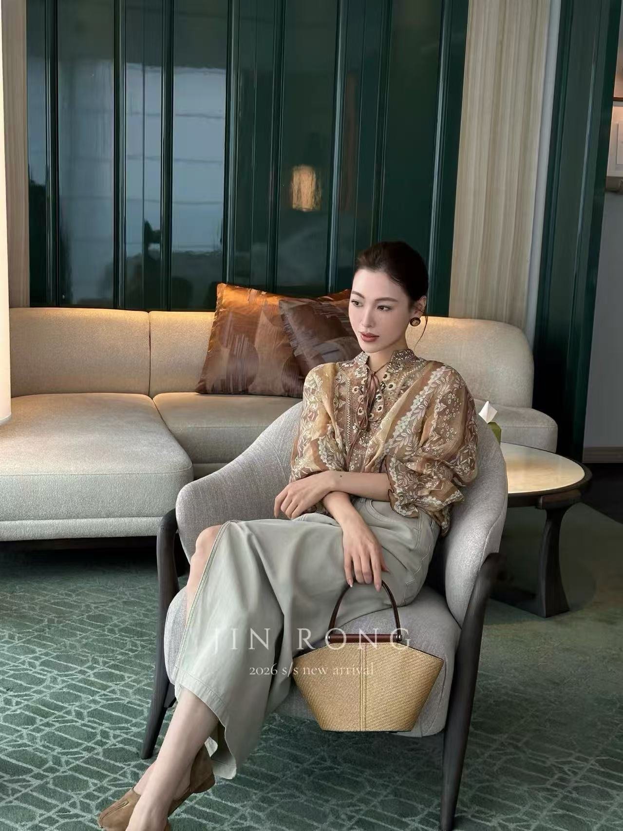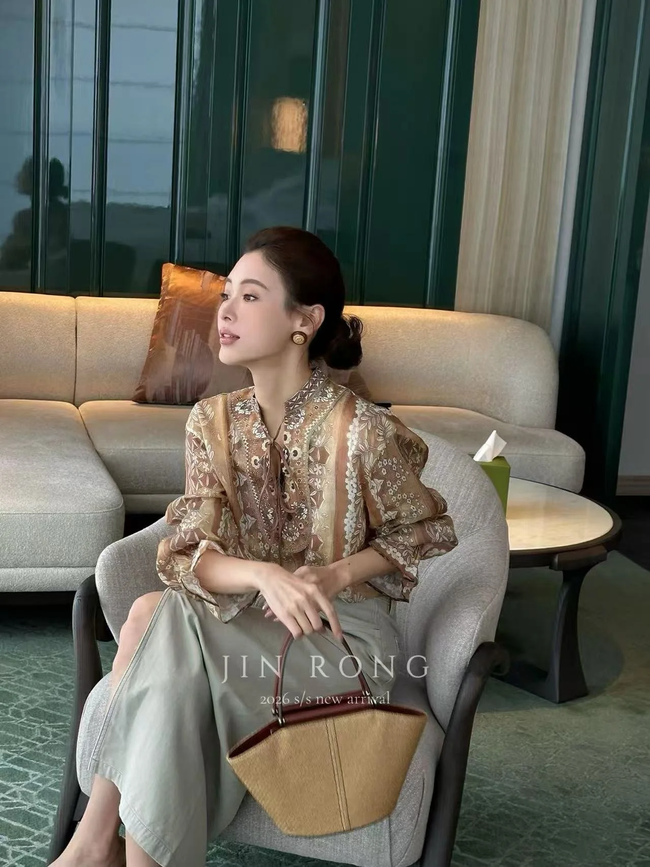 Crafted from lightweight, breathable tencel blend fabric with a sheer soft-focus texture, it’s lightweight and sweat-free in spring and summer. The excellent drape makes it flow elegantly with every step. The blouse is covered with tea-brown base + retro floral totems, blending bohemian lace trims and geometric patterns—rich, delicate, and full of gentle luxury under light and shadow.