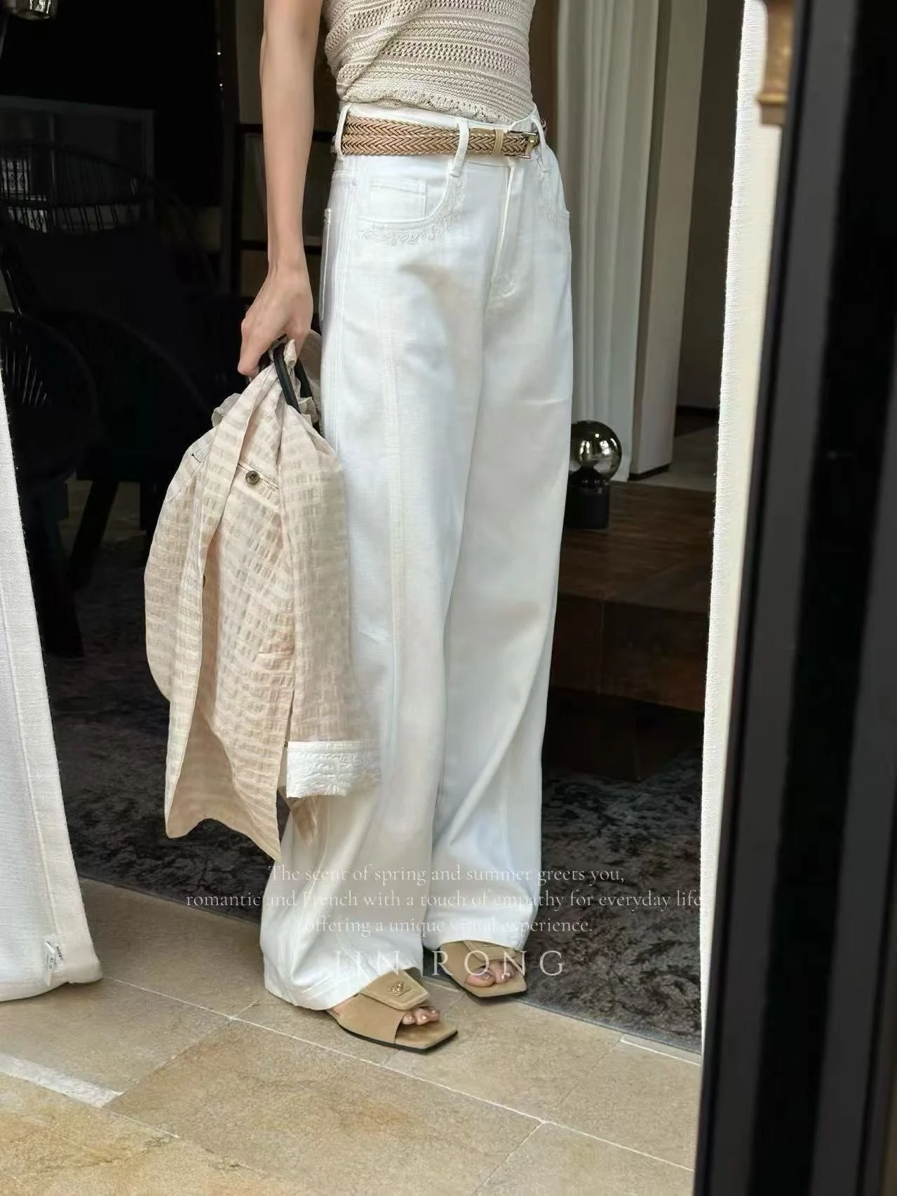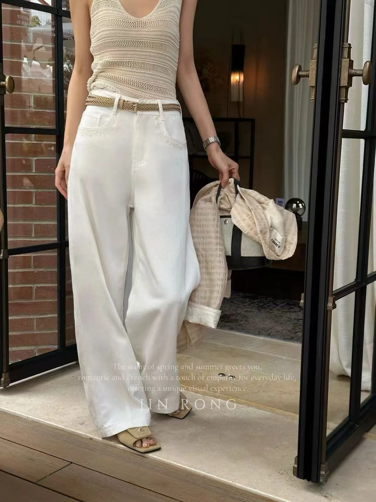 • Jeans: Soft and skin-friendly white denim fabric, the high-waisted wide-leg silhouette flatters proportions, lace trims on pockets add romance, with excellent drape and comfortable wear.