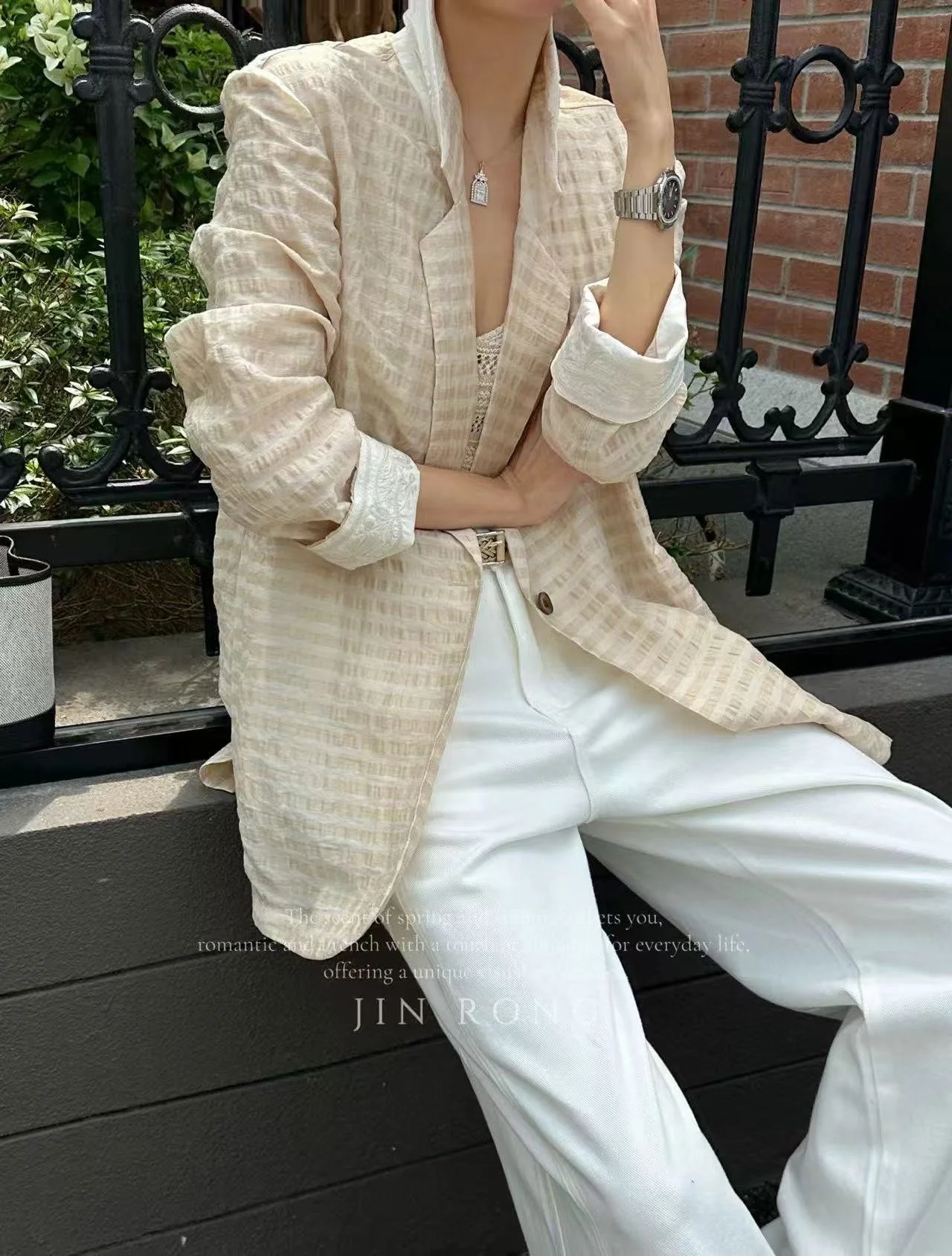 • Blazer: Crafted from lightweight and breathable linen-blend fabric with three-dimensional textured wrinkles, the light apricot color is gentle and healing. Delicate embroidered lace adorns the cuffs, and the loose dropped-shoulder silhouette hides flaws, casual yet luxurious.
