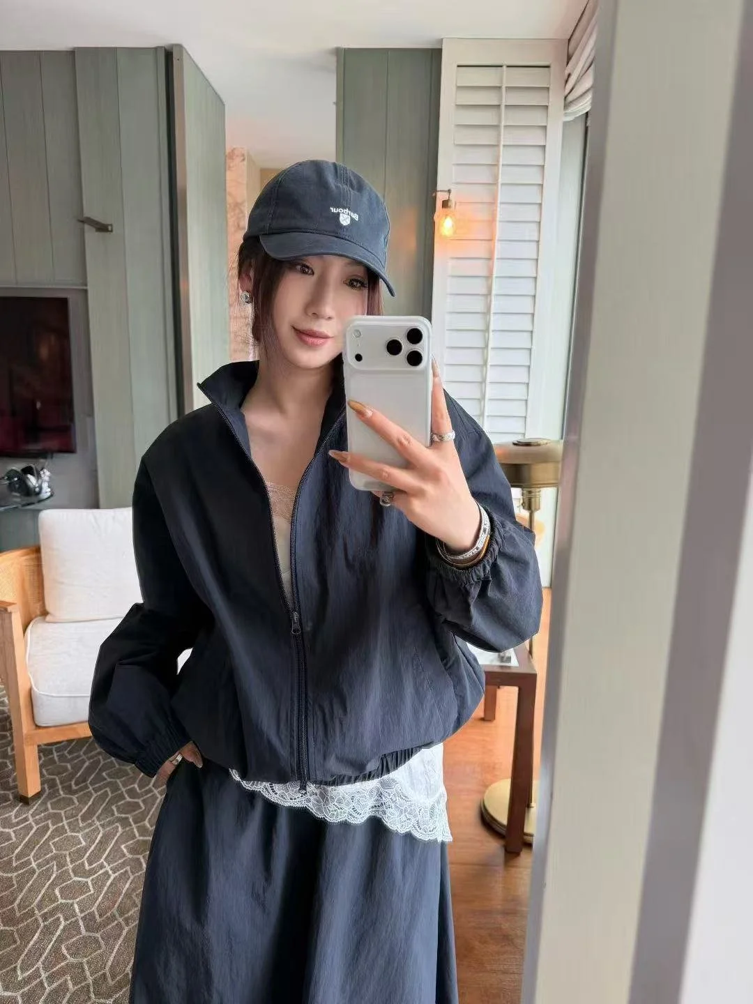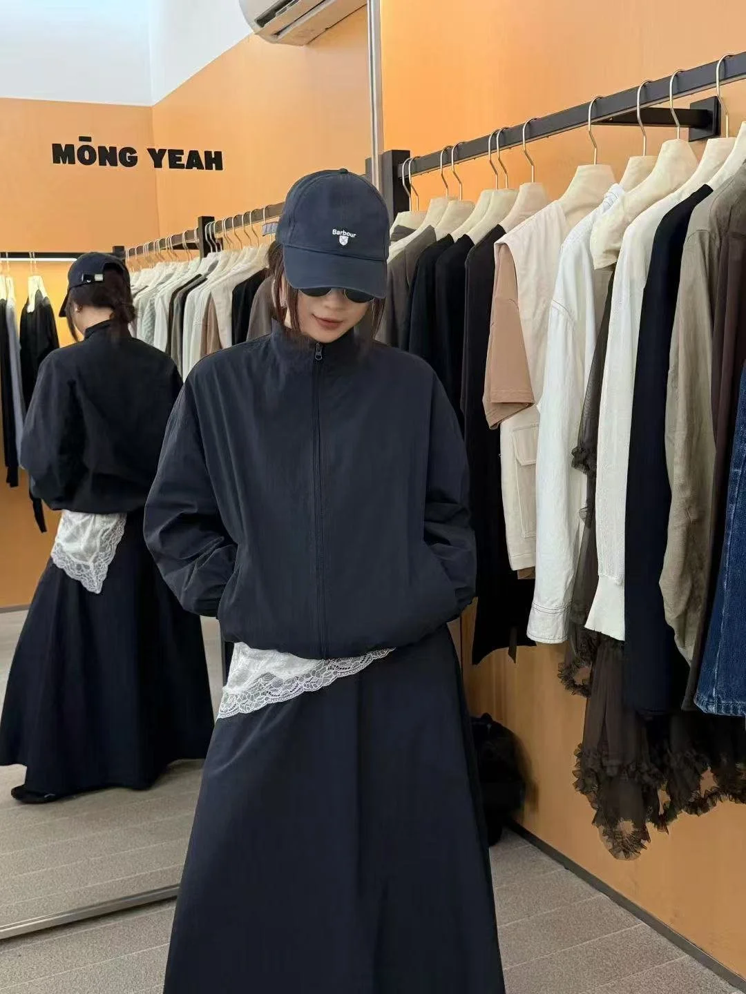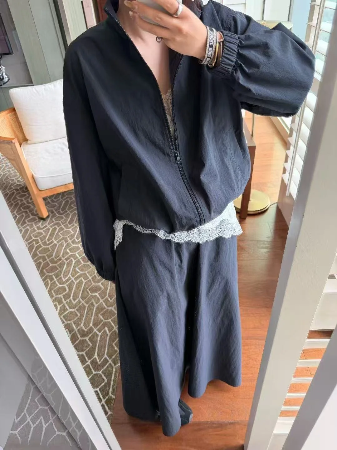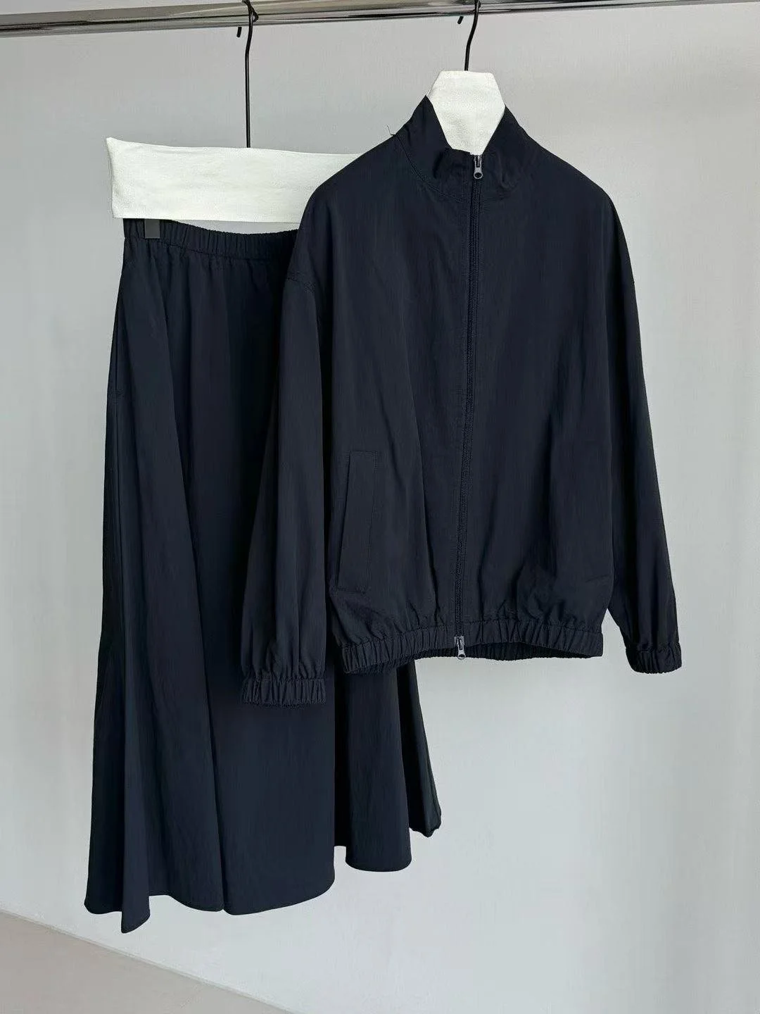 Simple stand-collar zip jacket with flowing wide-hem skirt. Loose, neat fit and lightweight, breathable fabric. Easy to wear in one set, lazy yet sophisticated, perfect for daily commuting and casual outings