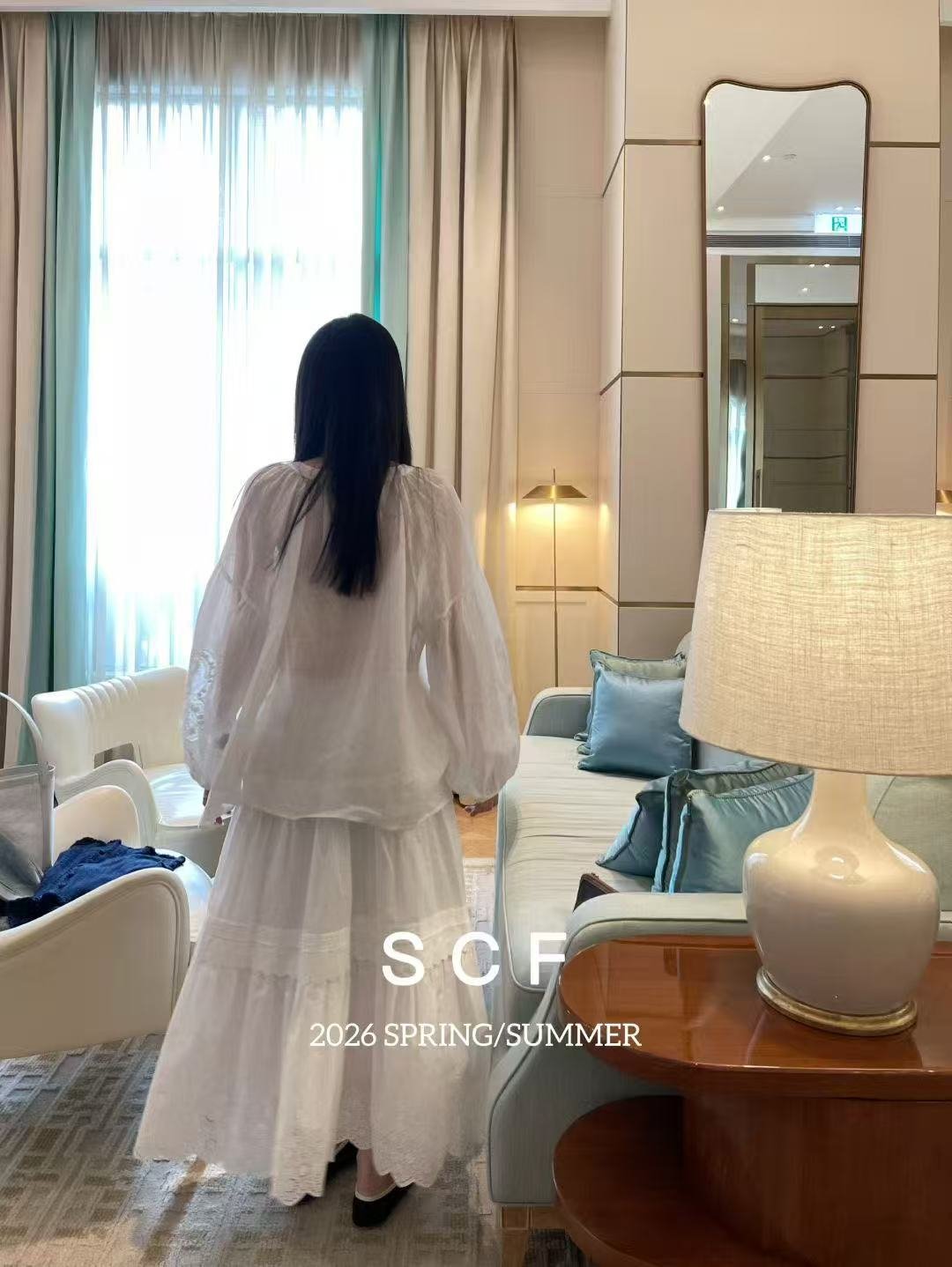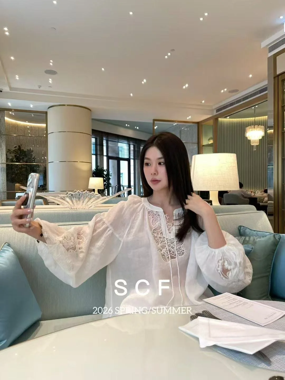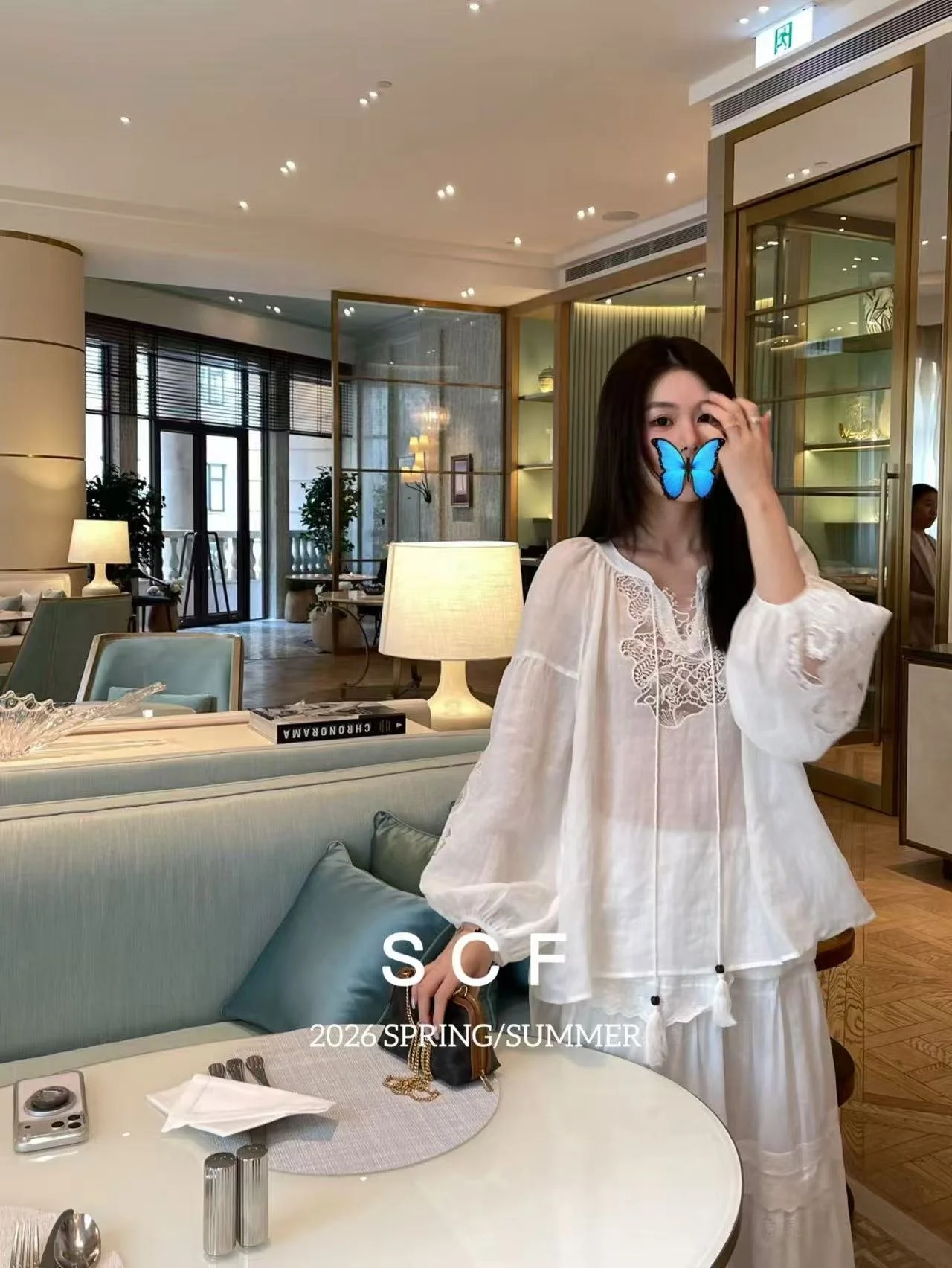 Description: Made of selected tencel fabric, lightweight and breathable. Heavy industry lace splicing adorns the neckline. Lantern sleeves create a lazy and casual look. Loose version fits all body types, creating a gentle and advanced French atmosphere.