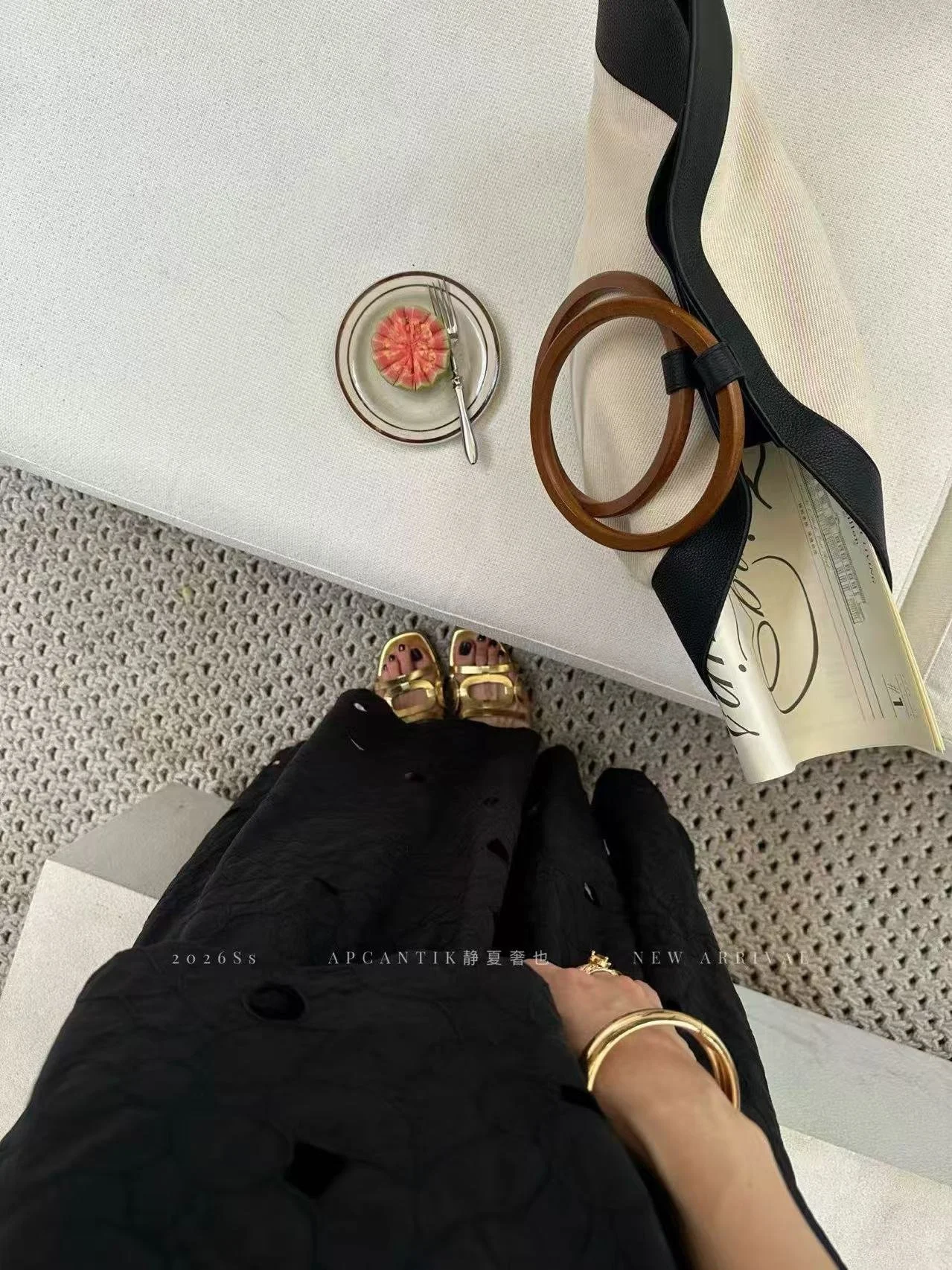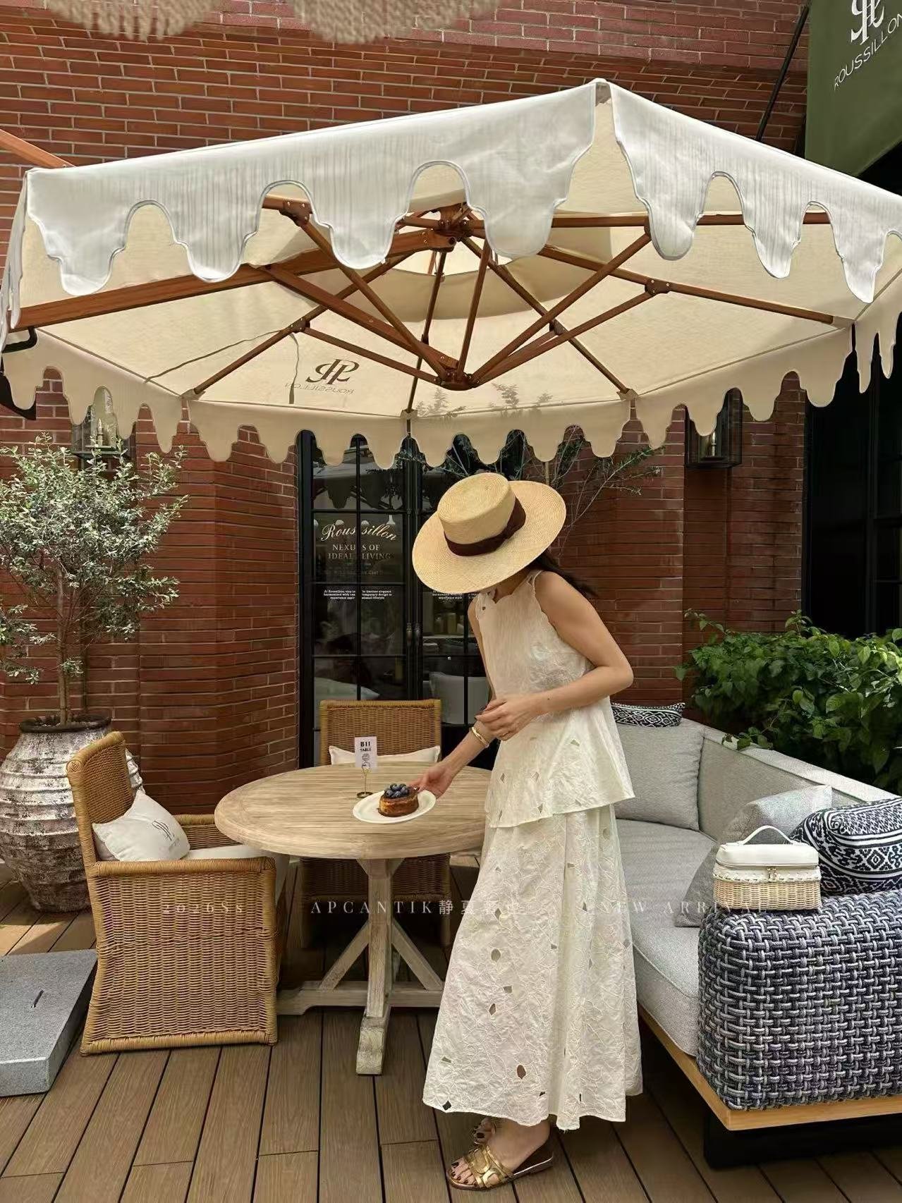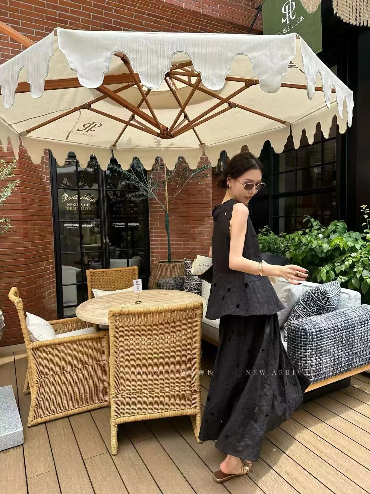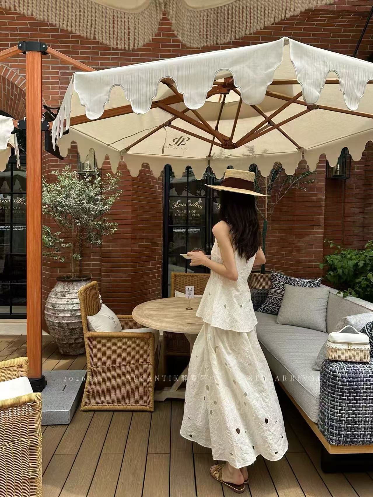 The matching long skirt features a flowing wide-leg design and loose fit, with hollow-out patterns echoing the top. Available in black and white, it effortlessly creates a romantic French aesthetic.