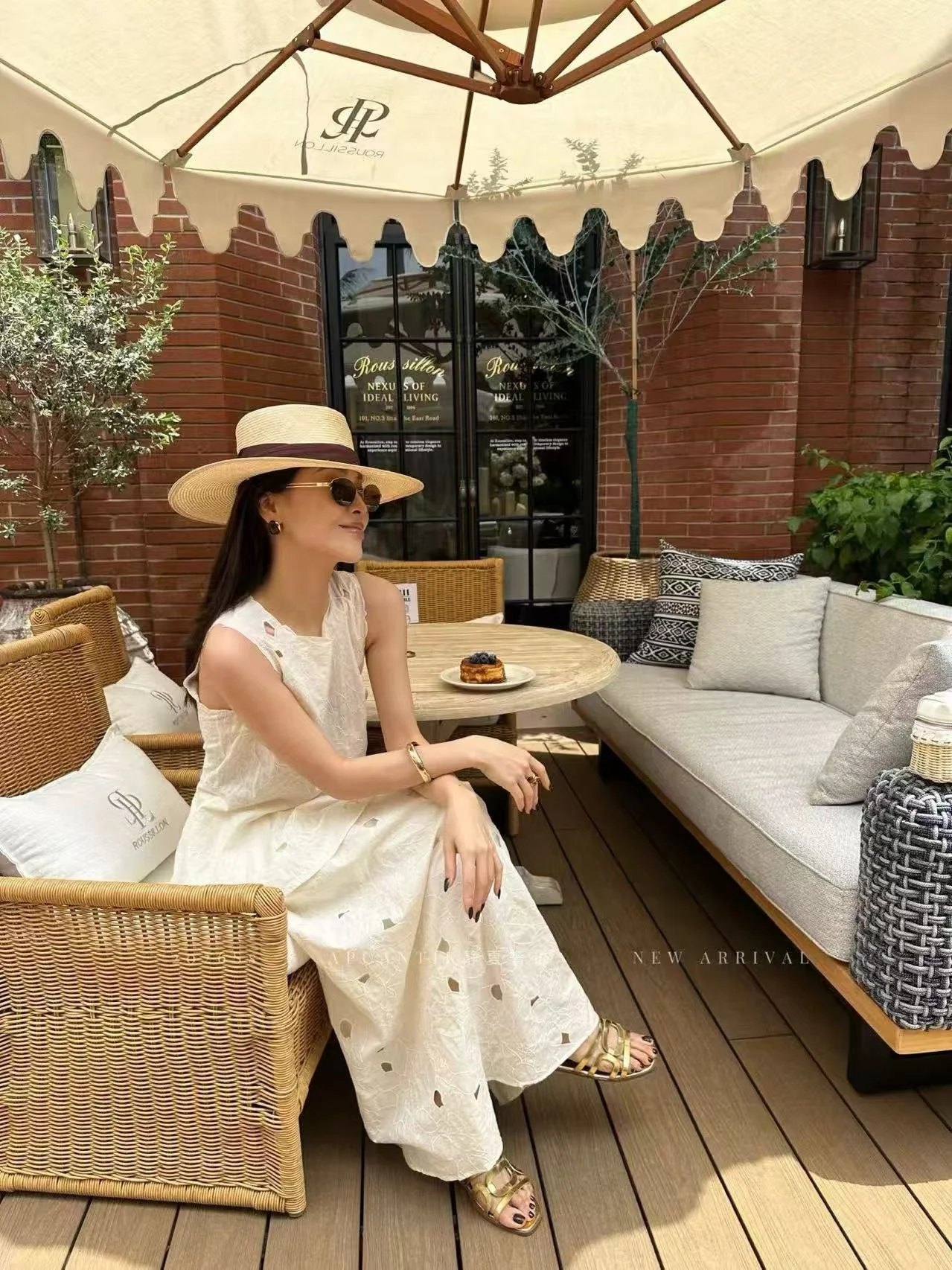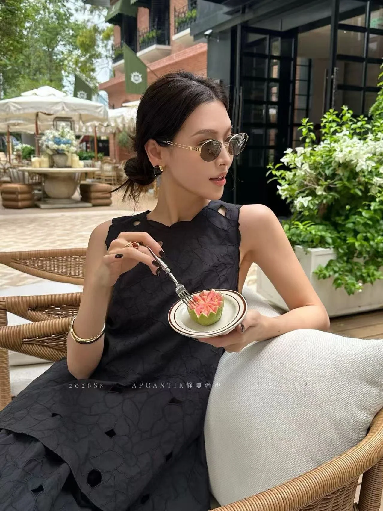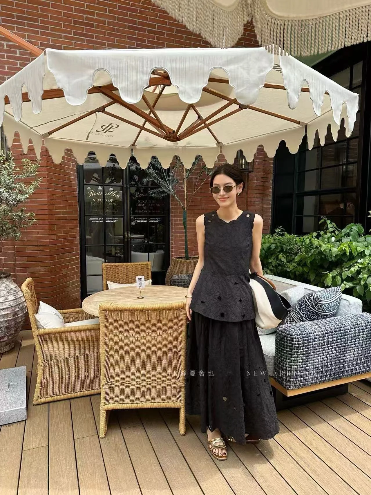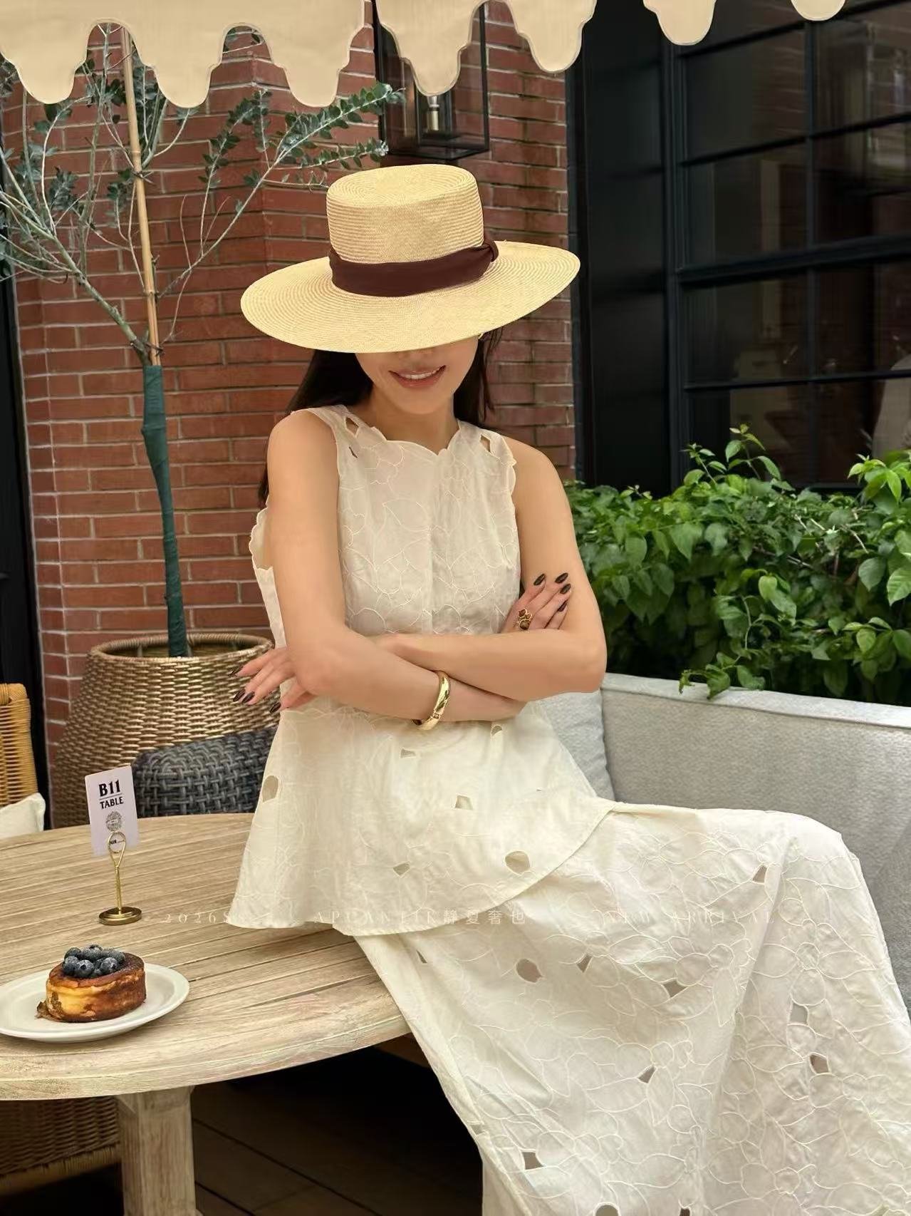 The top is made of exquisite hollow-out embroidered fabric, with a sleeveless waist-cinching cut that flatters the figure, paired with a simple round neck and wavy lace for elegant sophistication;