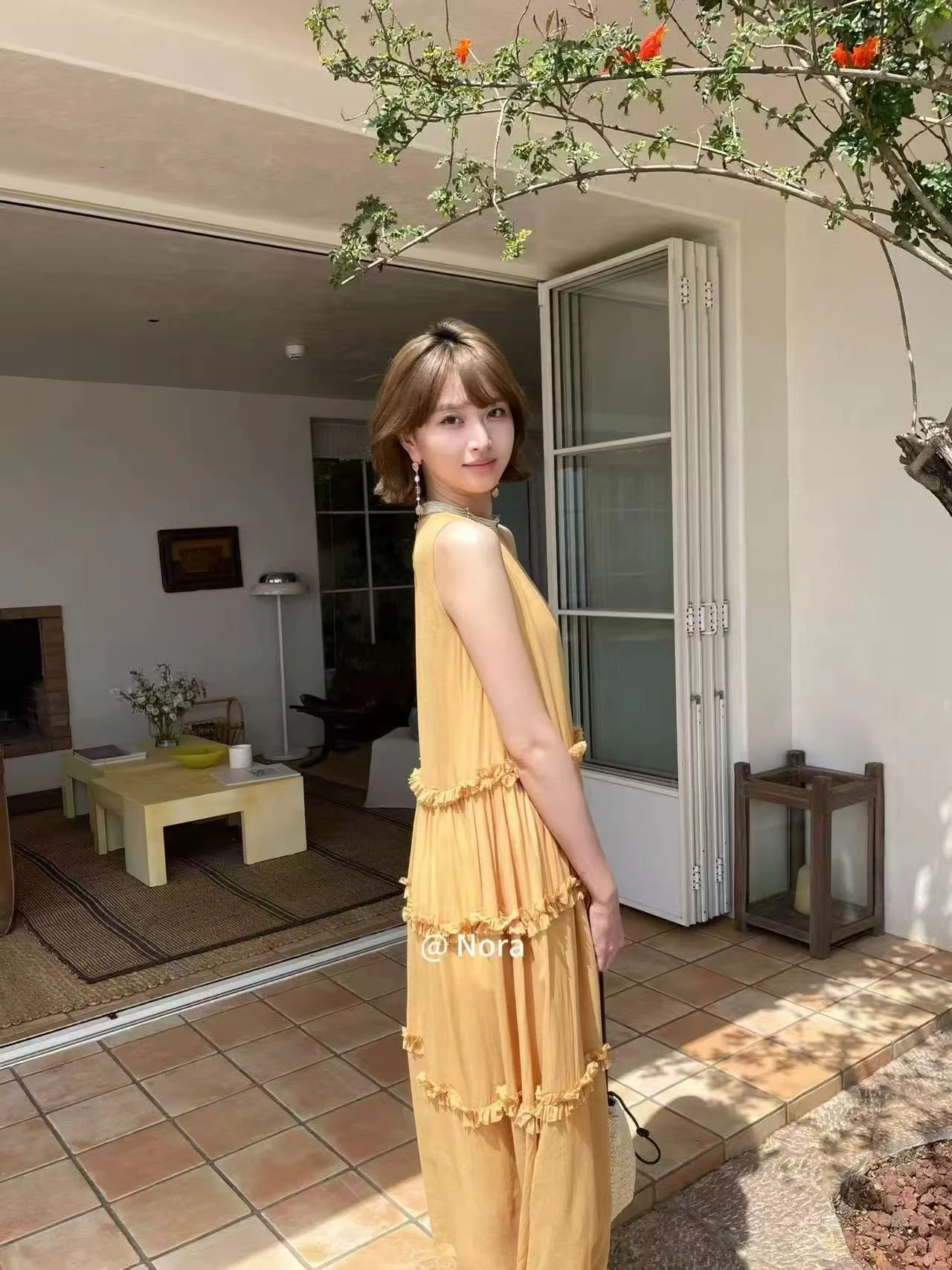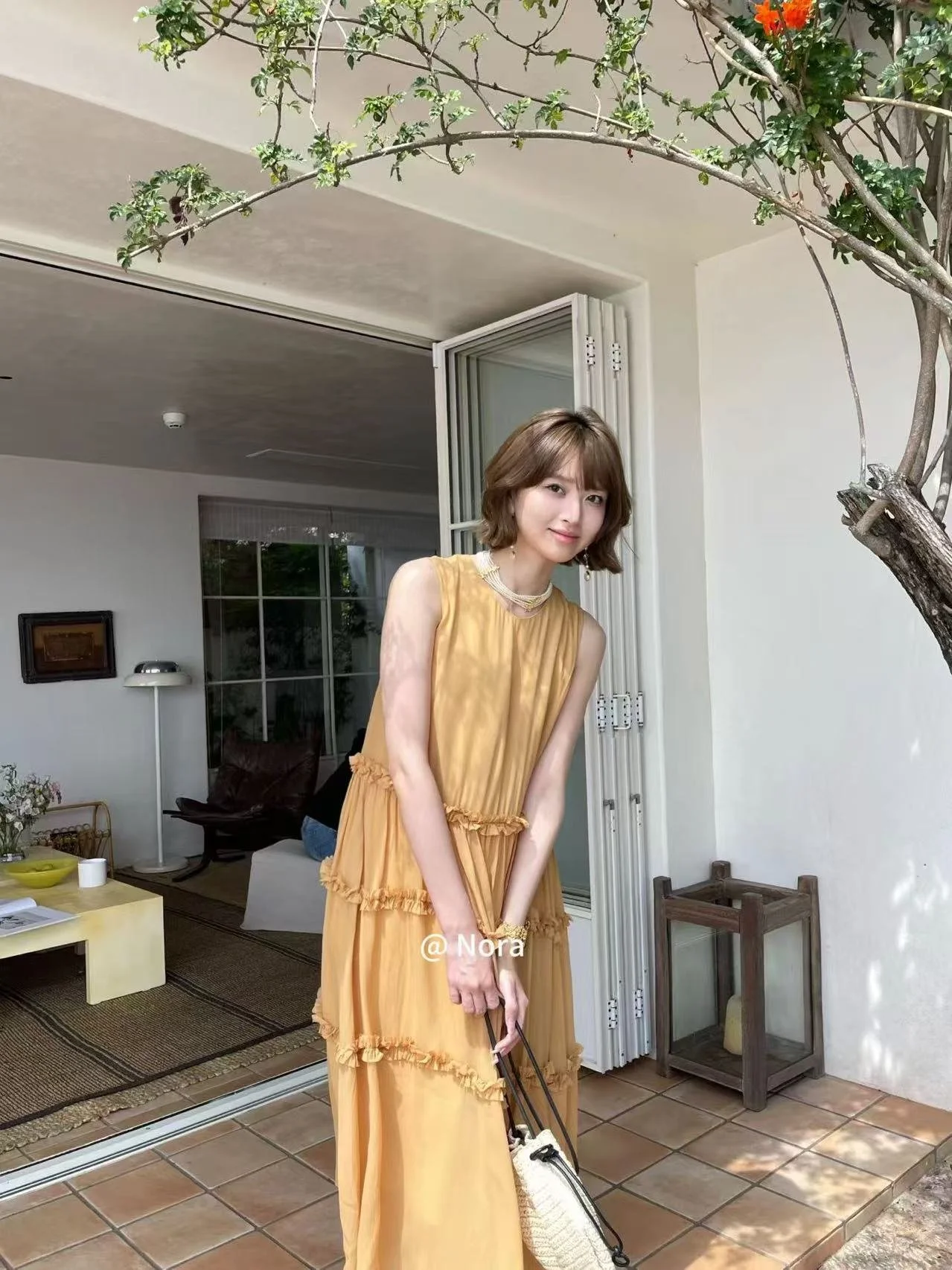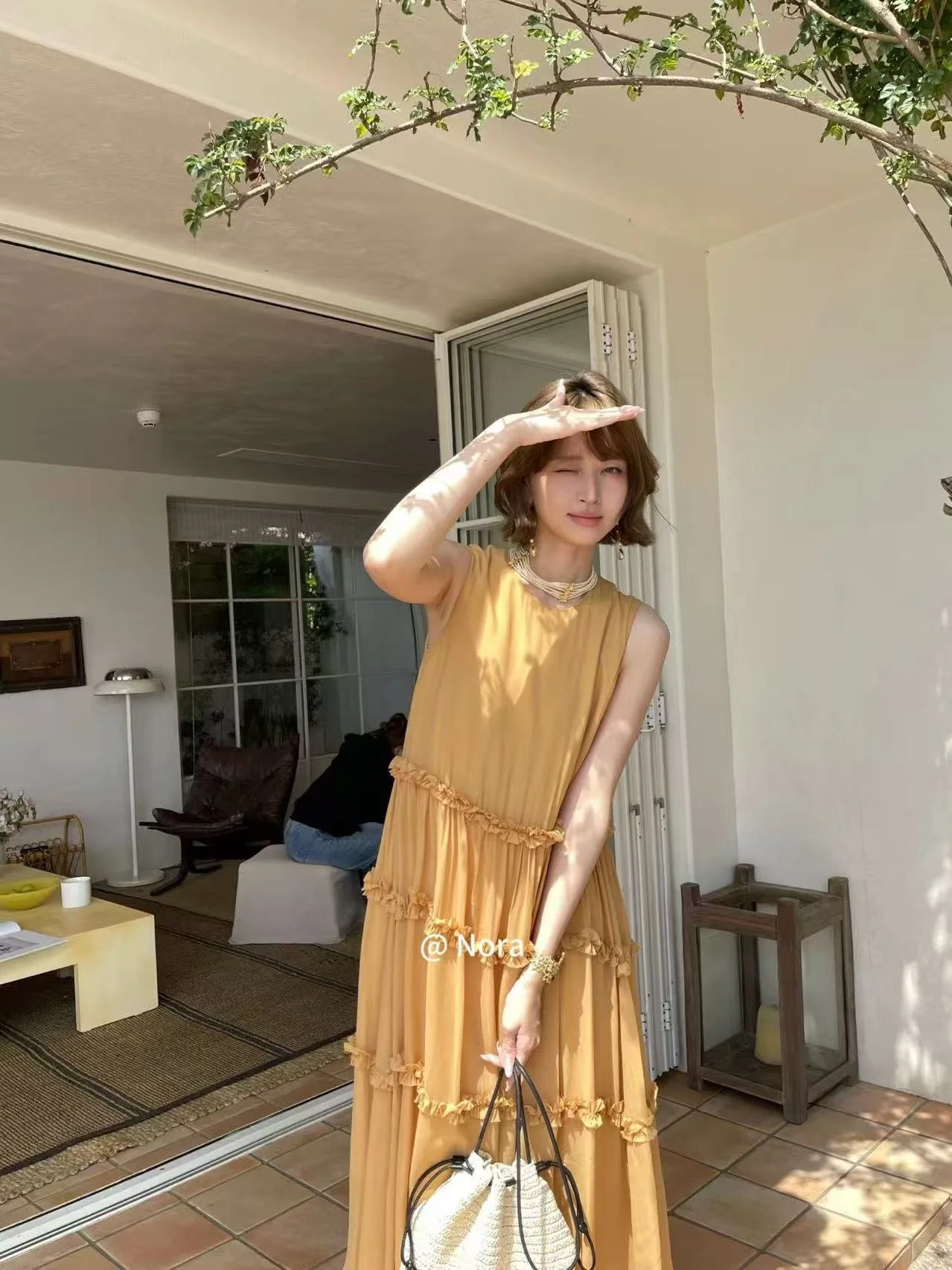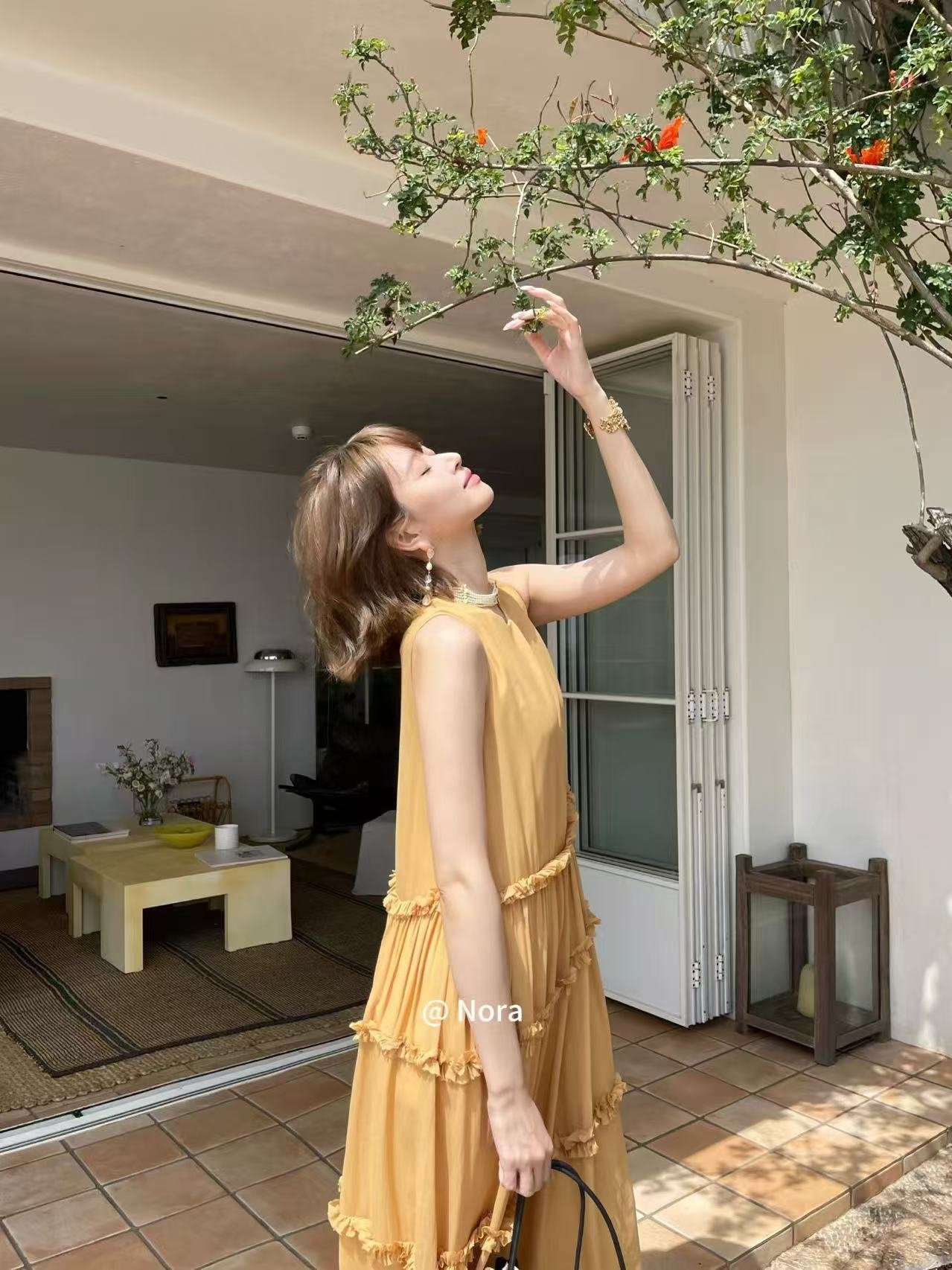 ✨ Unlock the relaxed vacation vibe of summer! This warm ginger yellow sleeveless dress comes with a soft glow filter, a must-have for early summer outings.