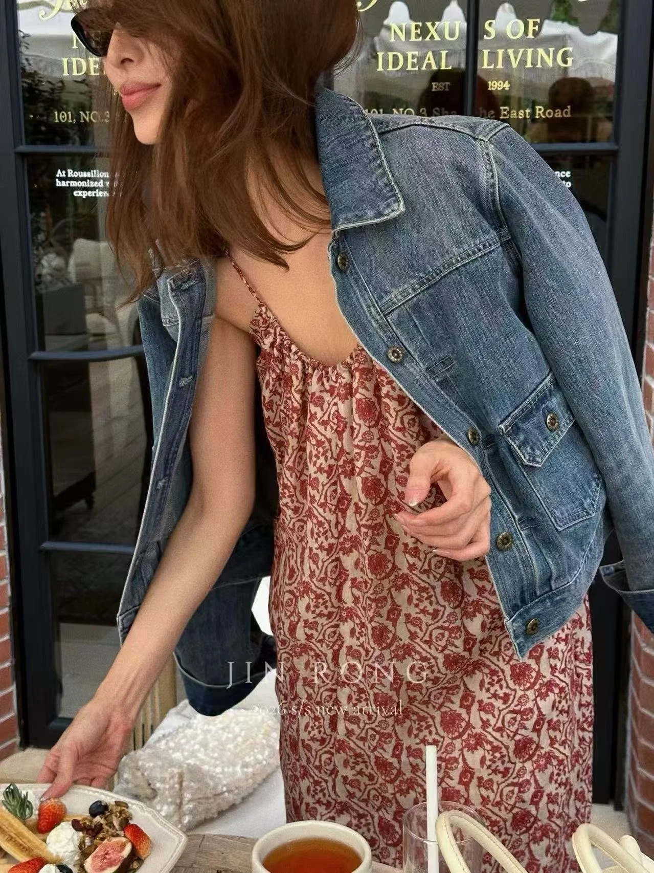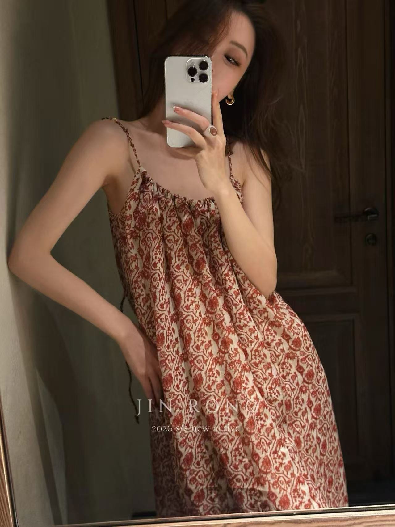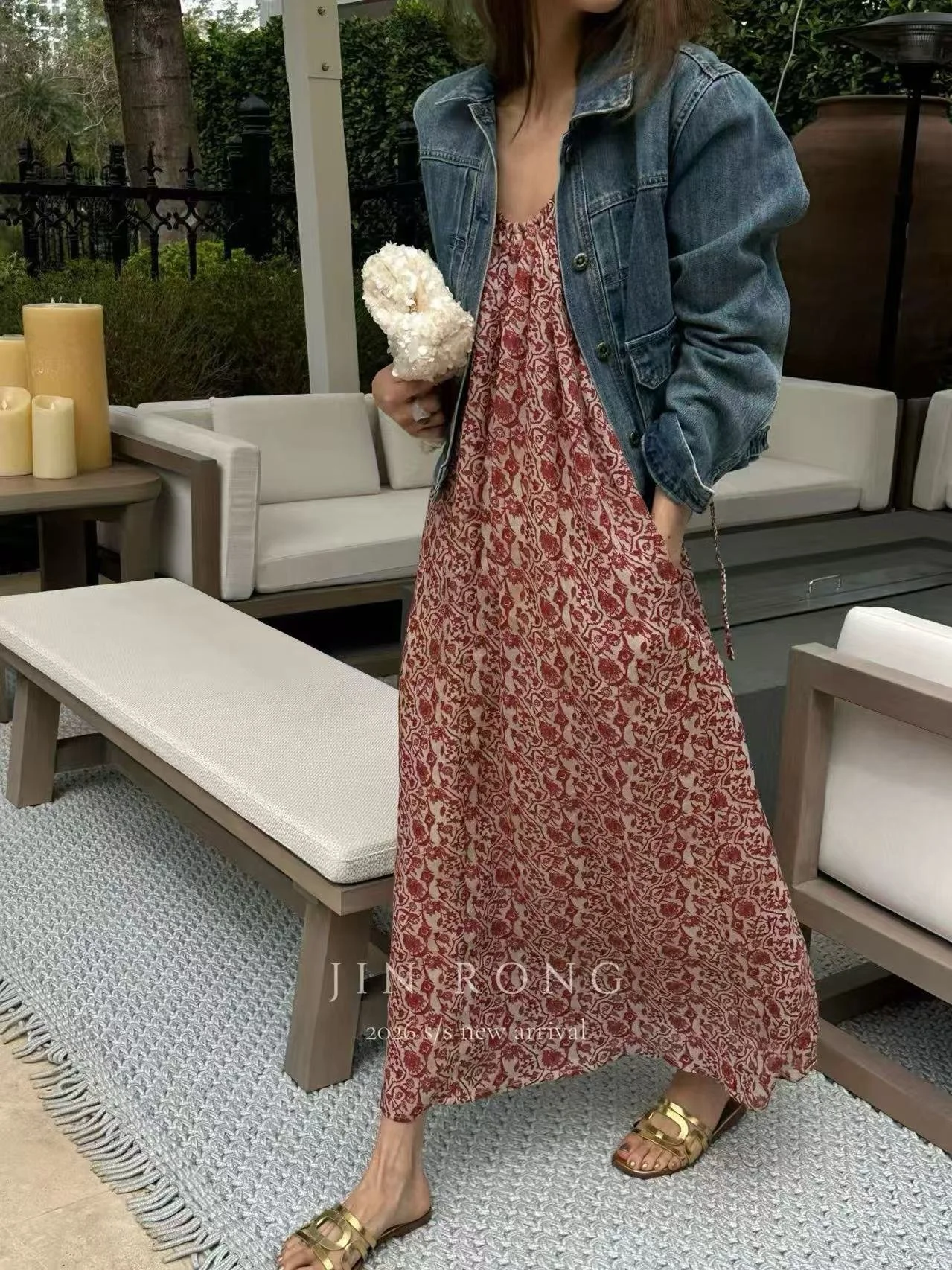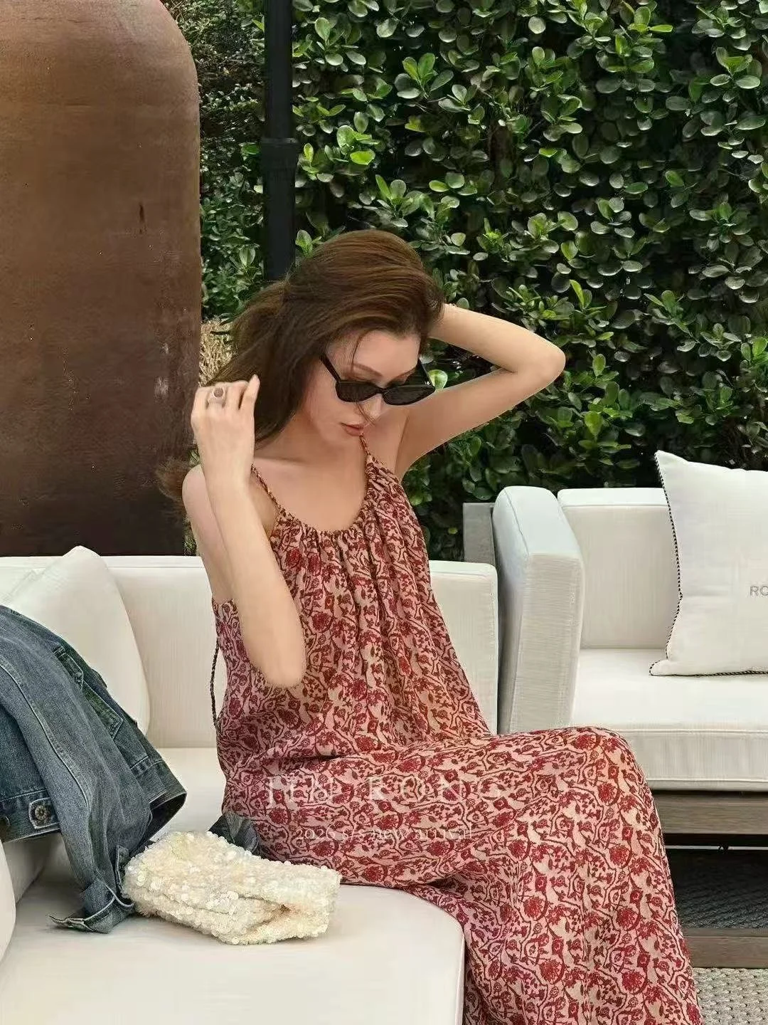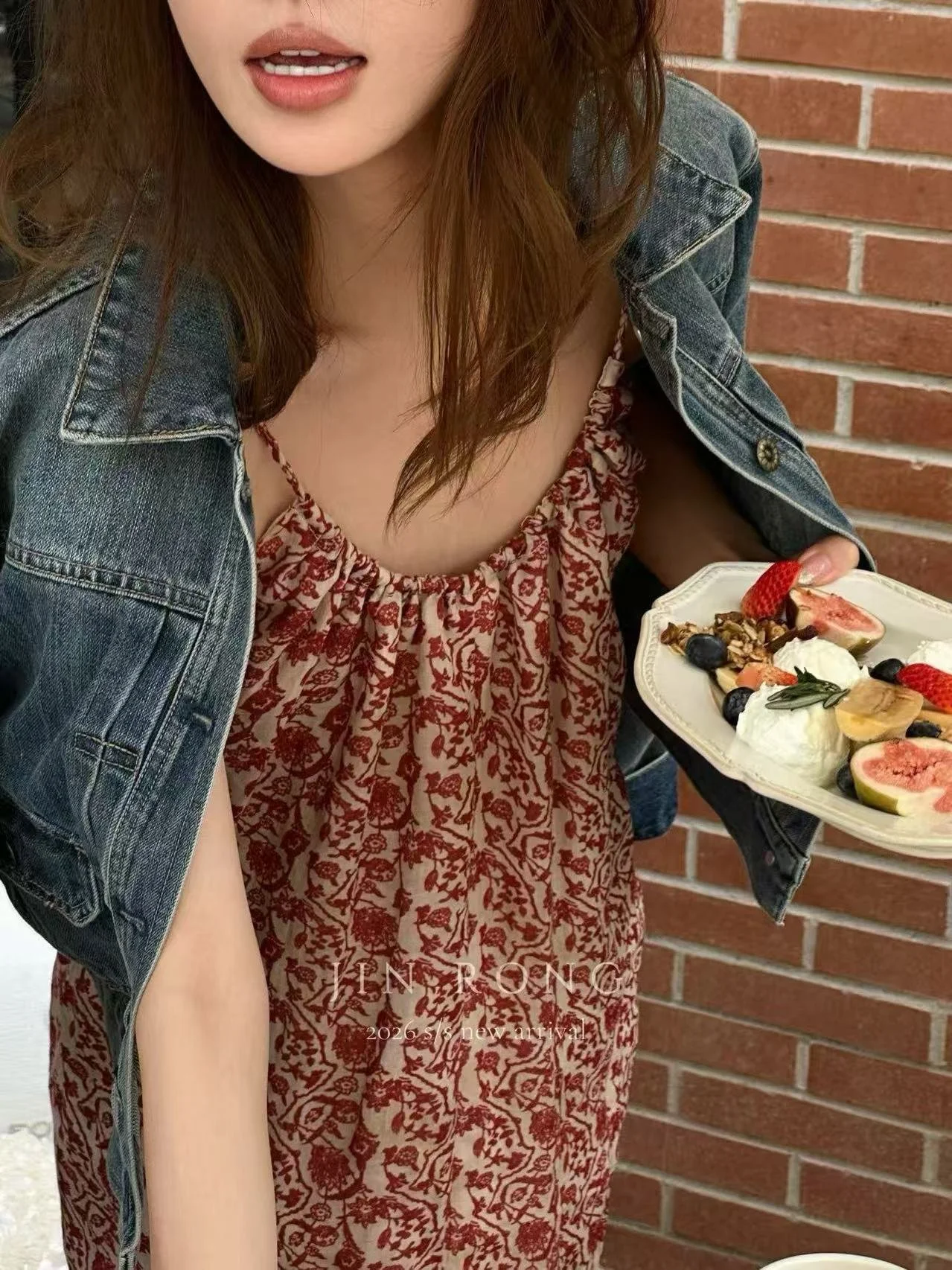 ✨ Wear the passion and laziness of a French Riviera vacation on you! This red-brown floral slip dress is the pinnacle of atmospheric styling.
