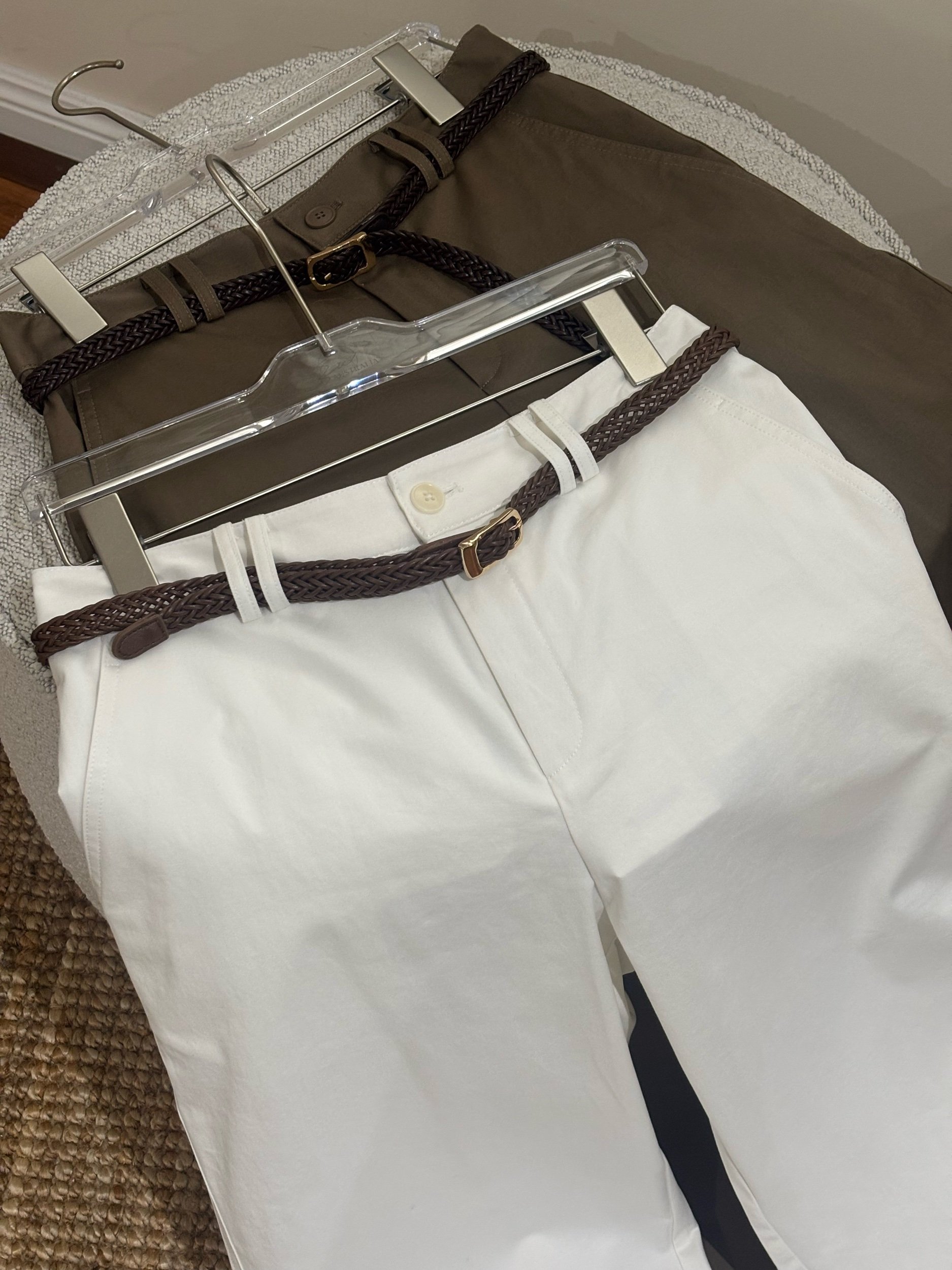 This casual pants come in two classic color options: coffee and white. The high-waisted straight-leg cut has a slimming effect, effortlessly shaping the leg line and optimizing the body proportion. The pants are paired with a matching braided belt, whose exquisite braided texture adds a retro touch and design ingenuity to the simple pant shape. The belt can be freely adjusted for tightness, further enhancing the comfort and styling of the outfit. The fabric is crisp with good drape, presenting a neat and uncluttered look when worn. Suitable for both daily casual outings and light office wear, it is a versatile piece for creating a simple and high-end style.