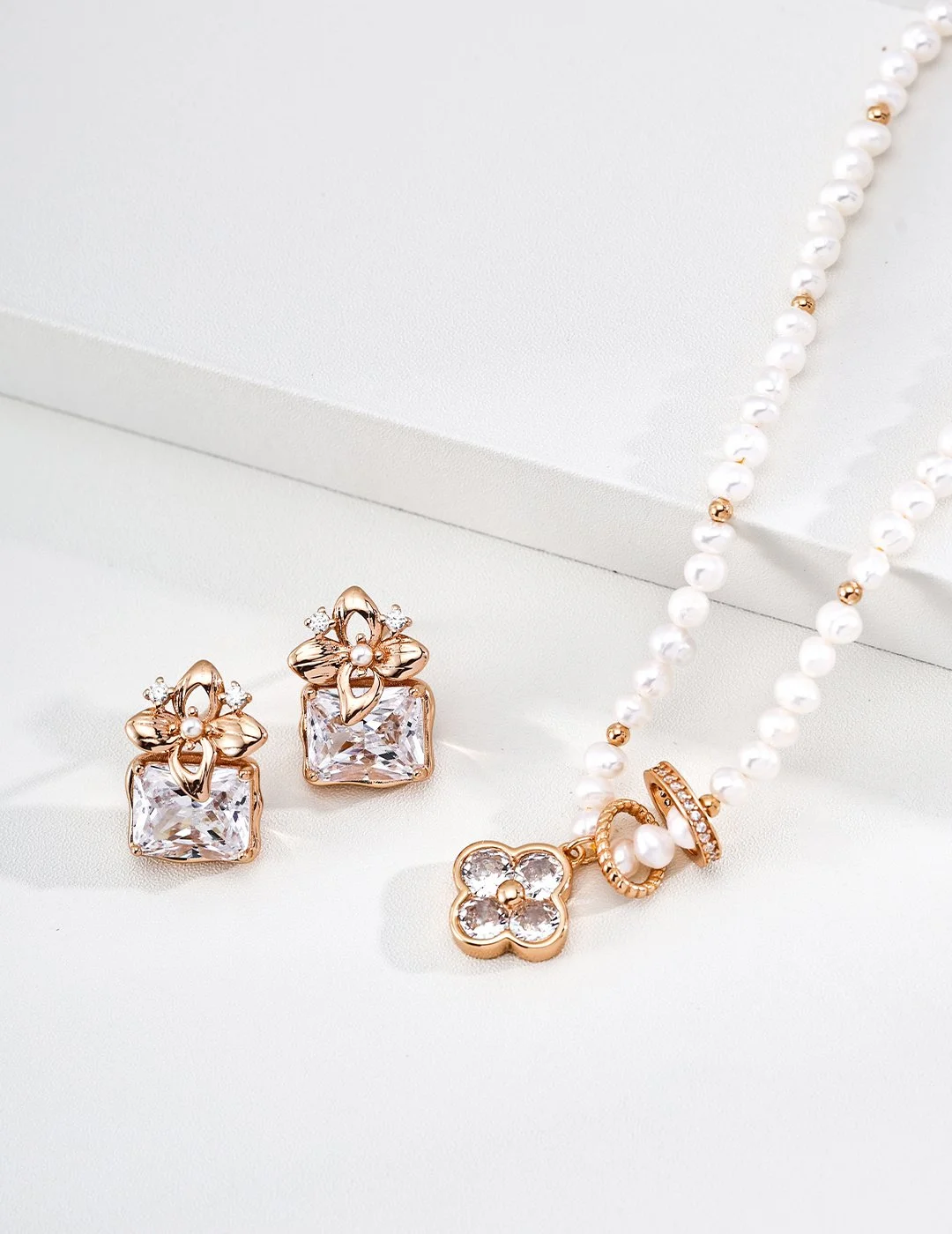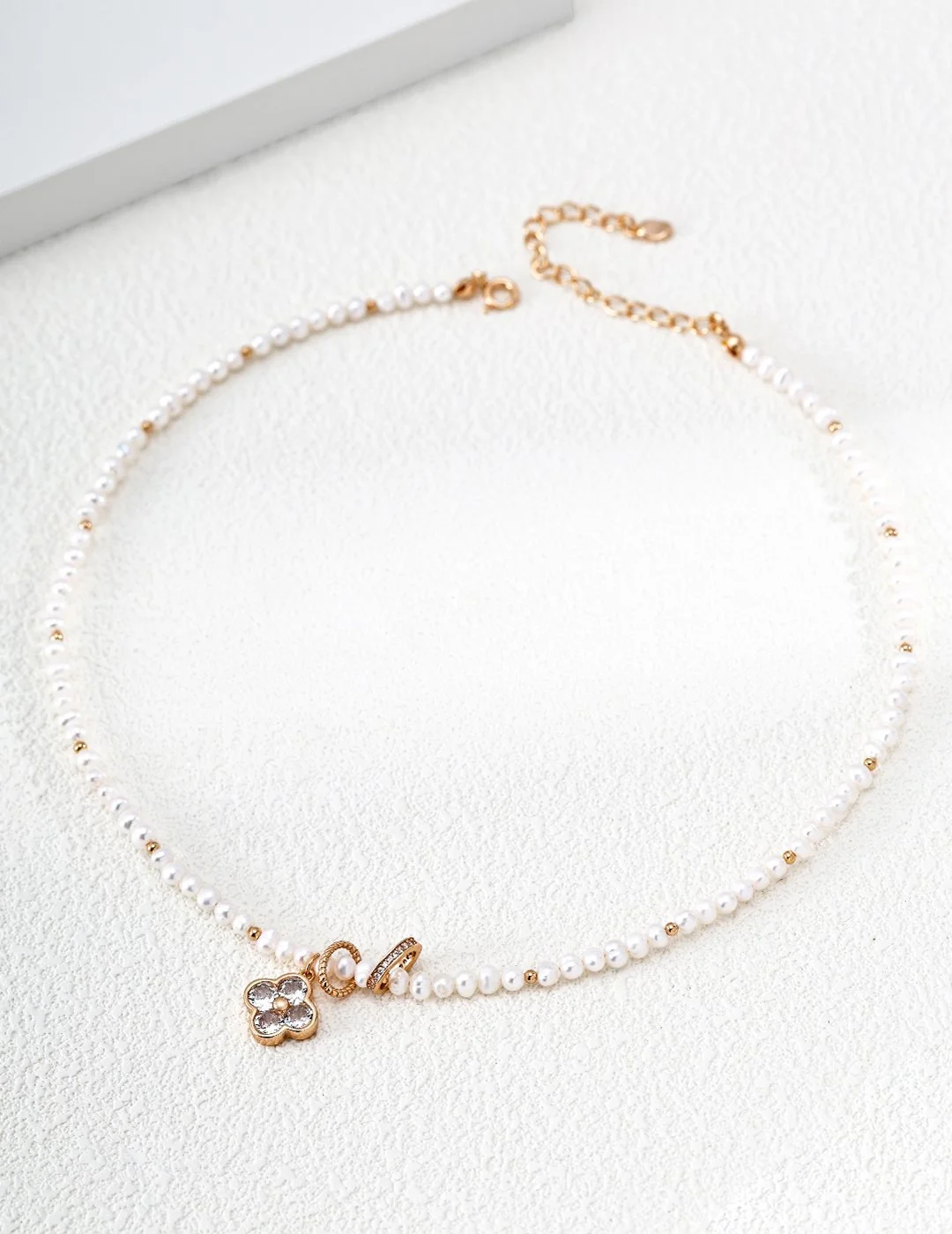 [Four Blessings of Wealth] Natural Pearl Zircon Necklace. — The four blessings bestowed by the clover come together to infuse this pearl necklace with good fortune.