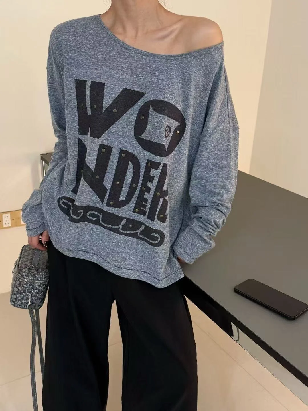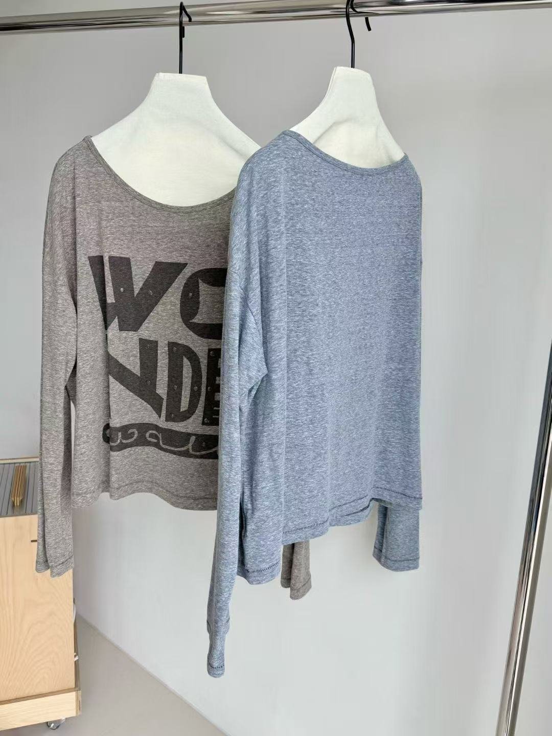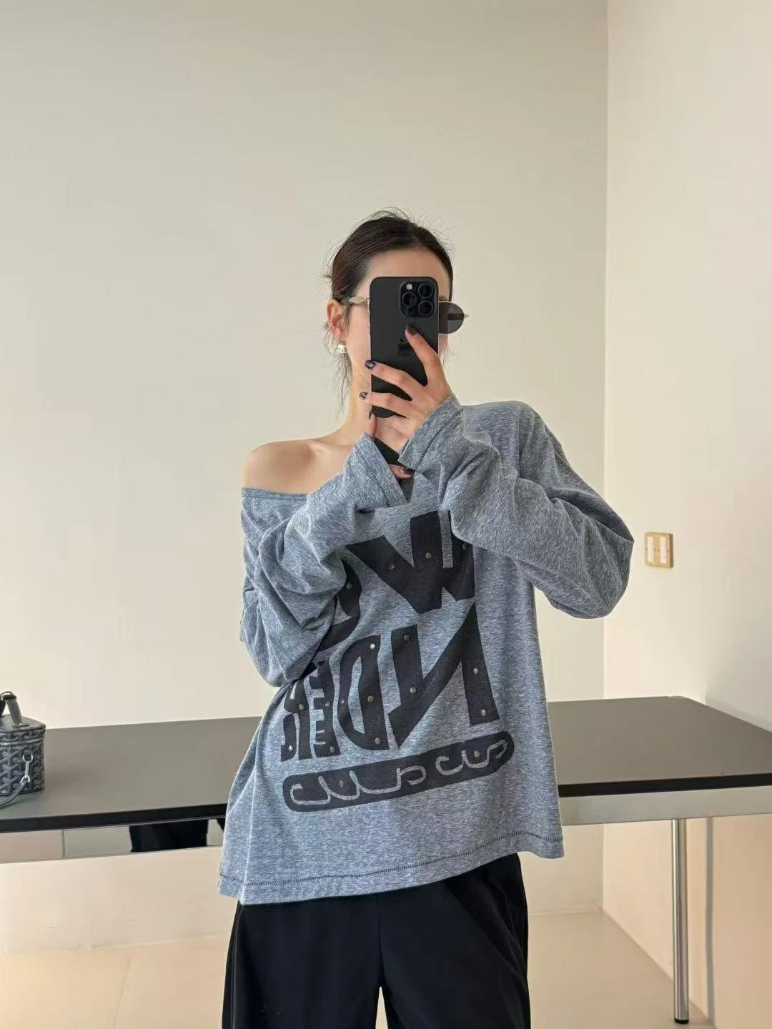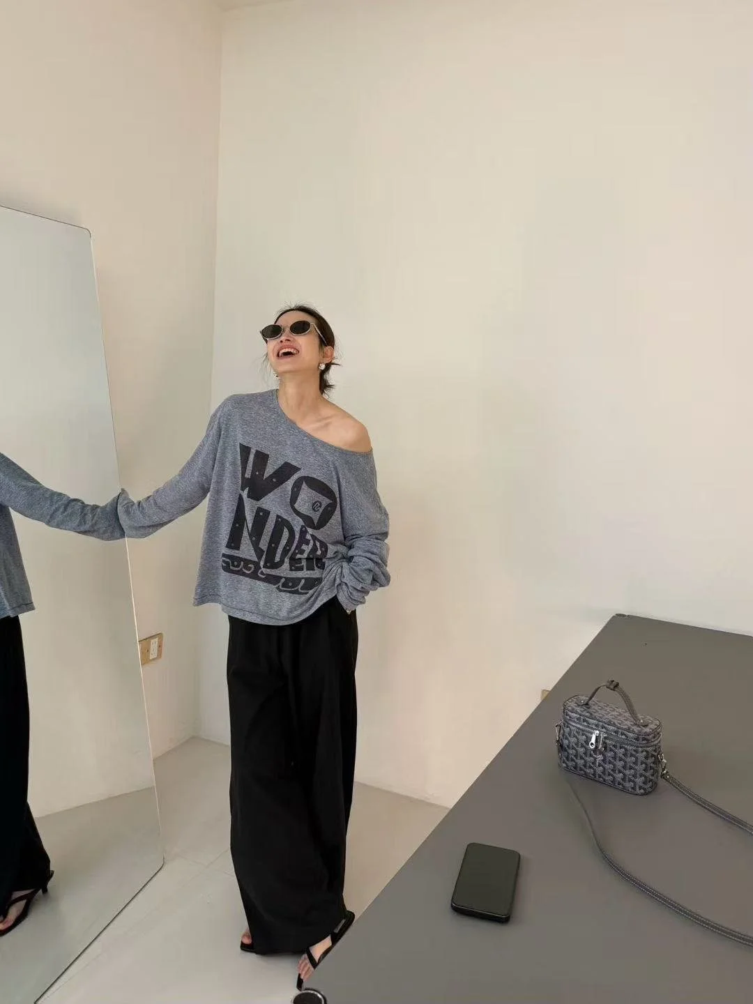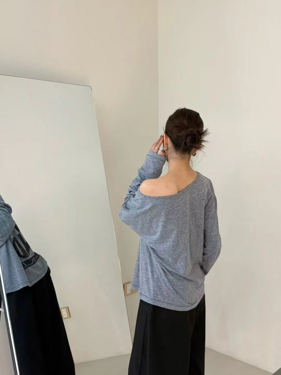Loose fit + soft cotton fabric, super comfortable to wear! The slanted shoulder design is laid-back yet stylish, and the gray and light gray-blue color combination is versatile and flattering for anyone. Great for everyday wear or taking photos - easily get that cute and cool girly vibe