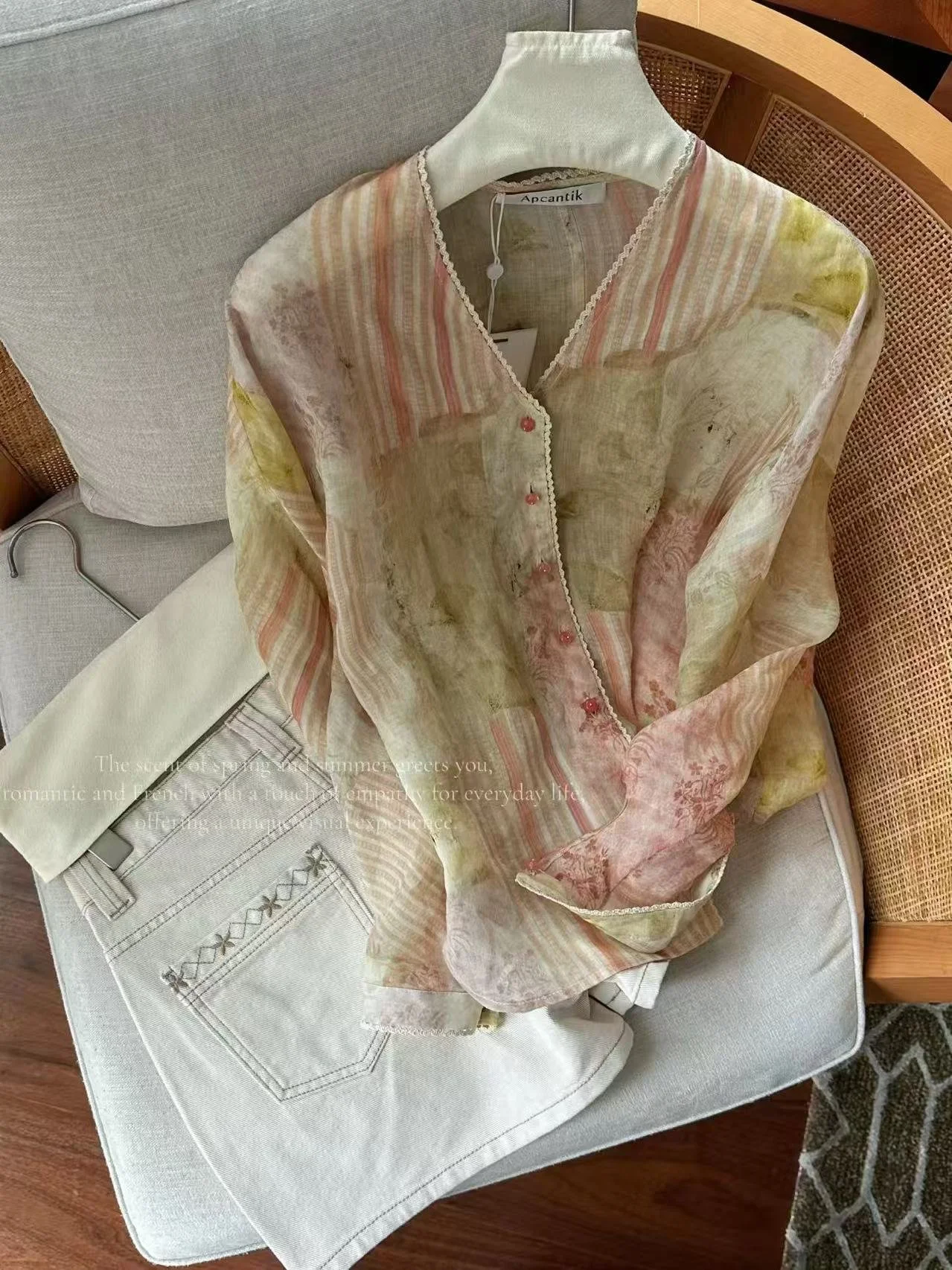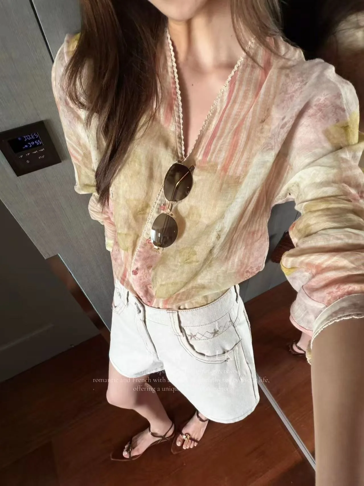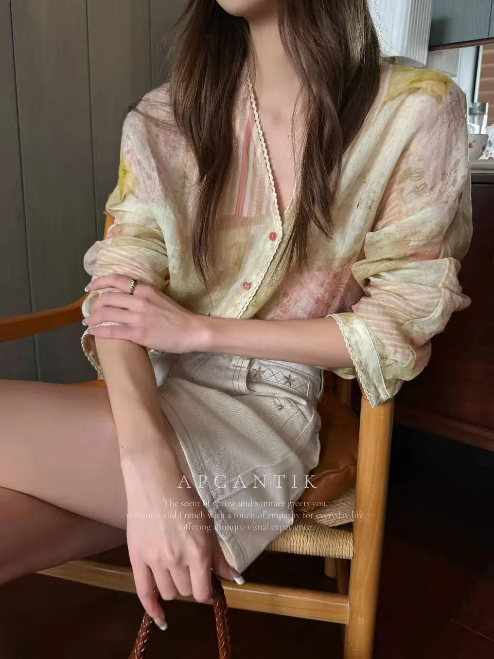 The artistic dyed color-block print is rich in layers, like blending spring flower fields into the garment, gentle and skin-brightening. The V-neck + lace trim design flatters the shoulder and neck lines, making the face look smaller and more elegant. Custom pink shell buttons adorn the placket, highlighting exquisite details.