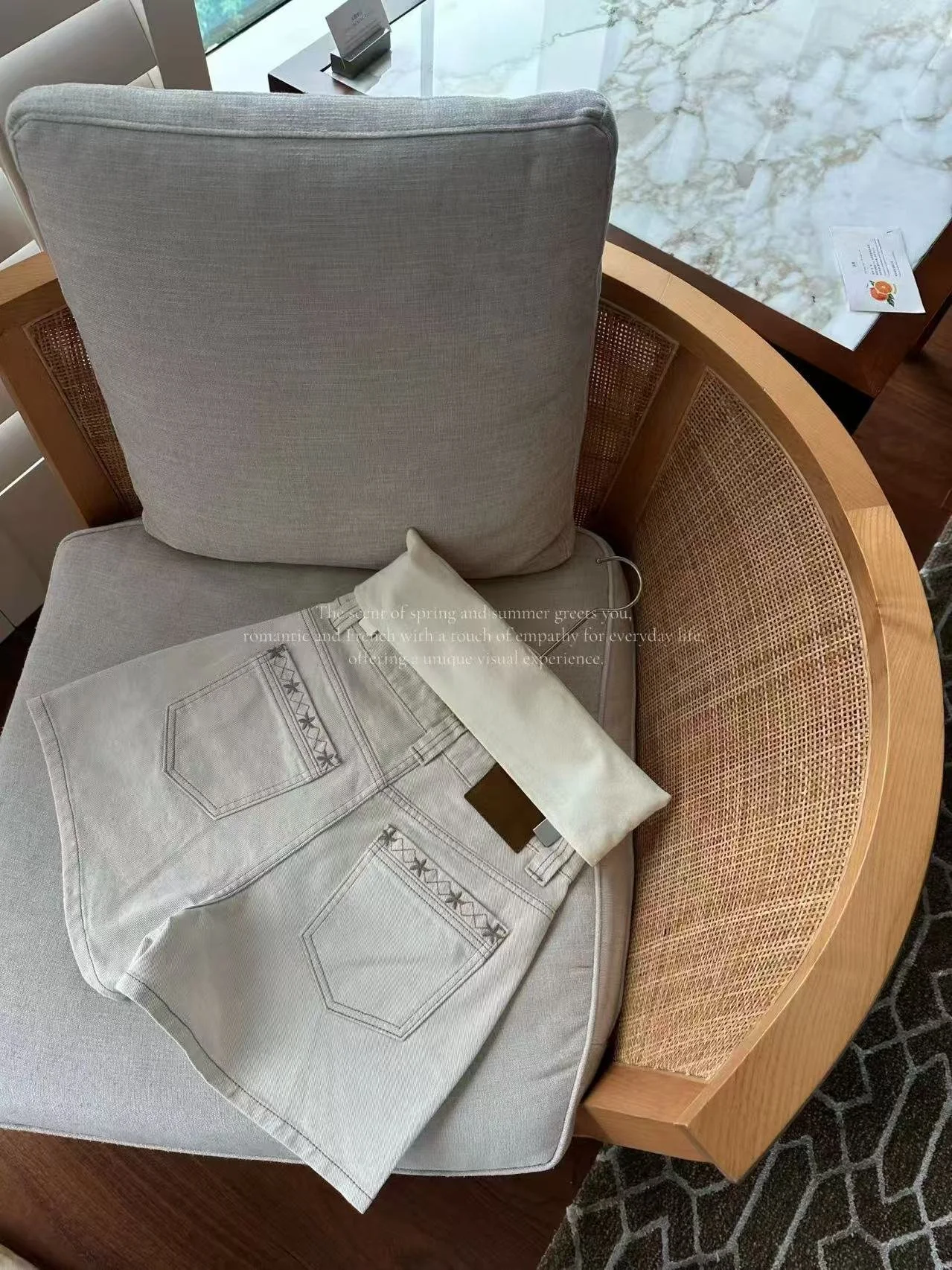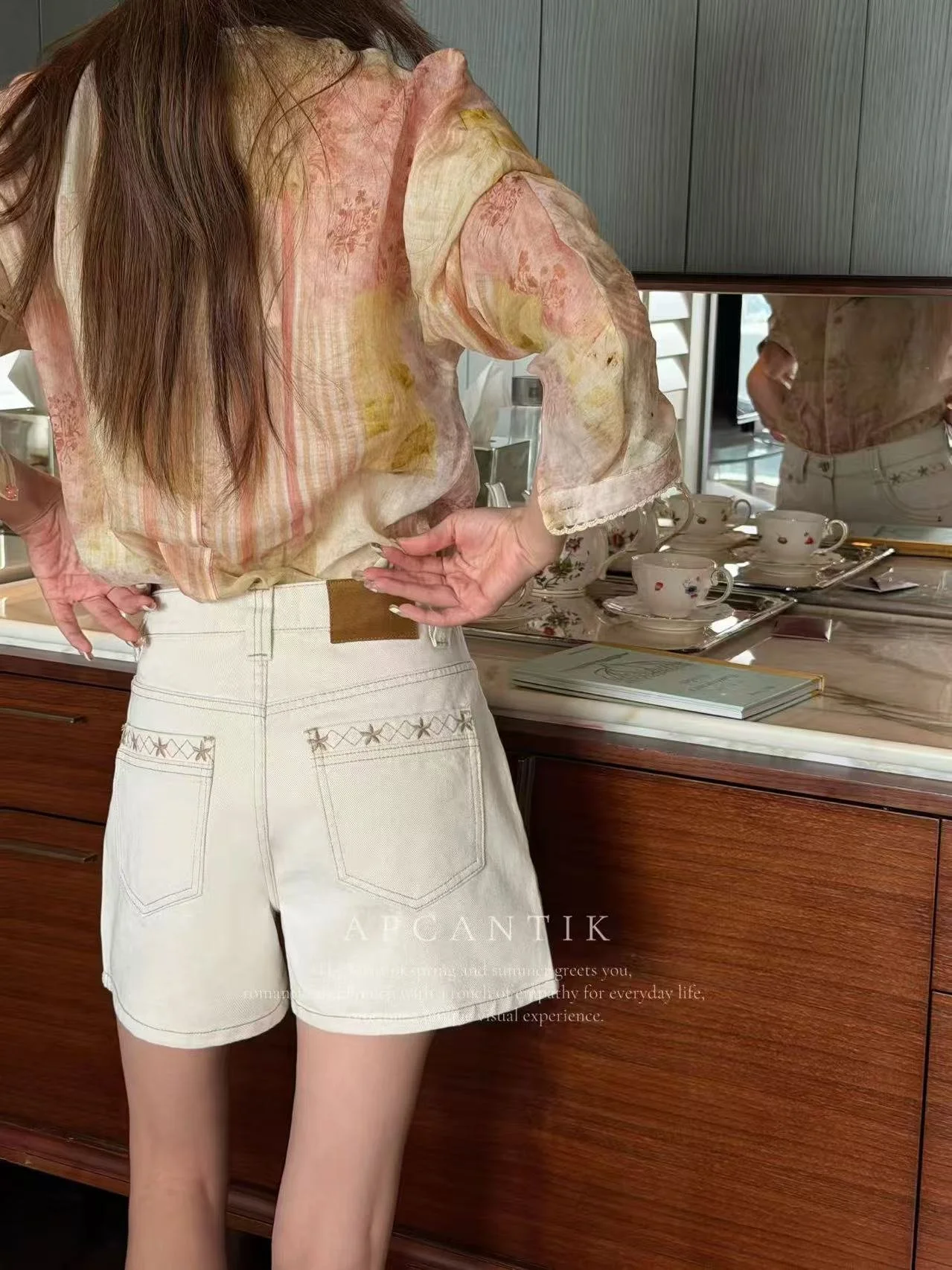 ✨ Unlock a fresh spring and summer vibe! These off-white embroidered high-waisted A-line denim shorts are a versatile slimming must-have for your wardrobe.