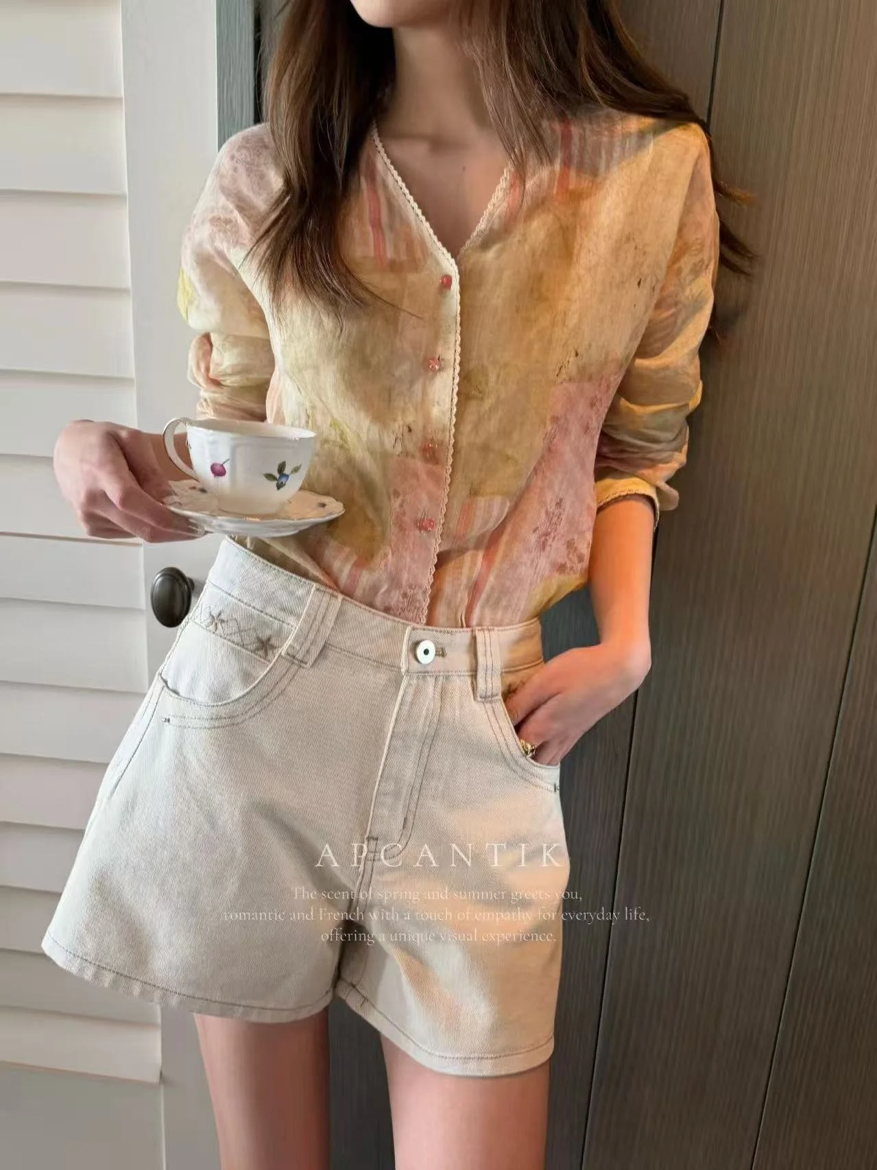 Dyed Print Lace V-Neck Tencel Shirt + Off-White Embroidered High-Waisted A-Line Denim Shorts Set