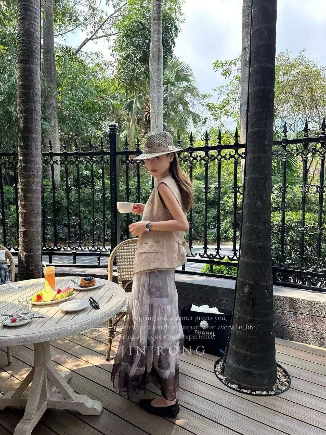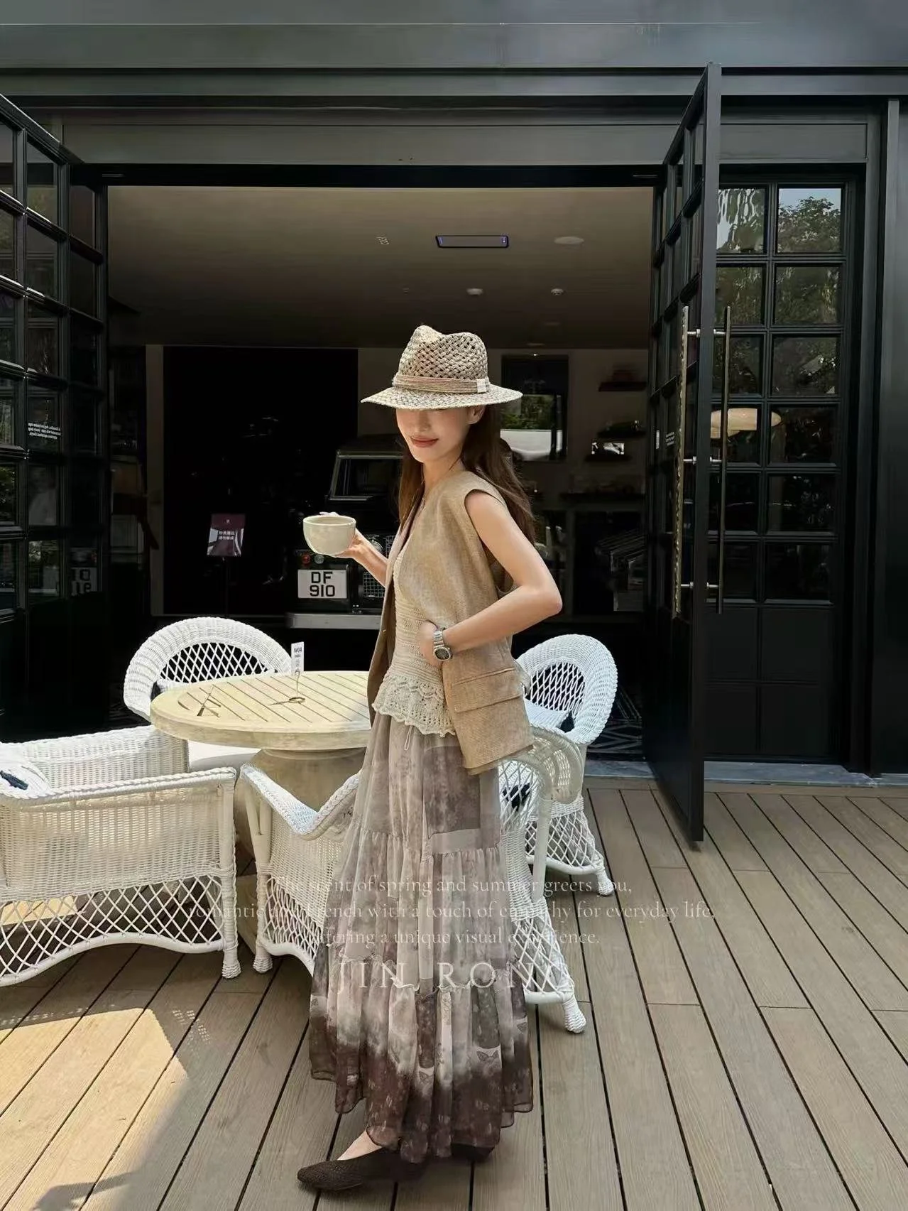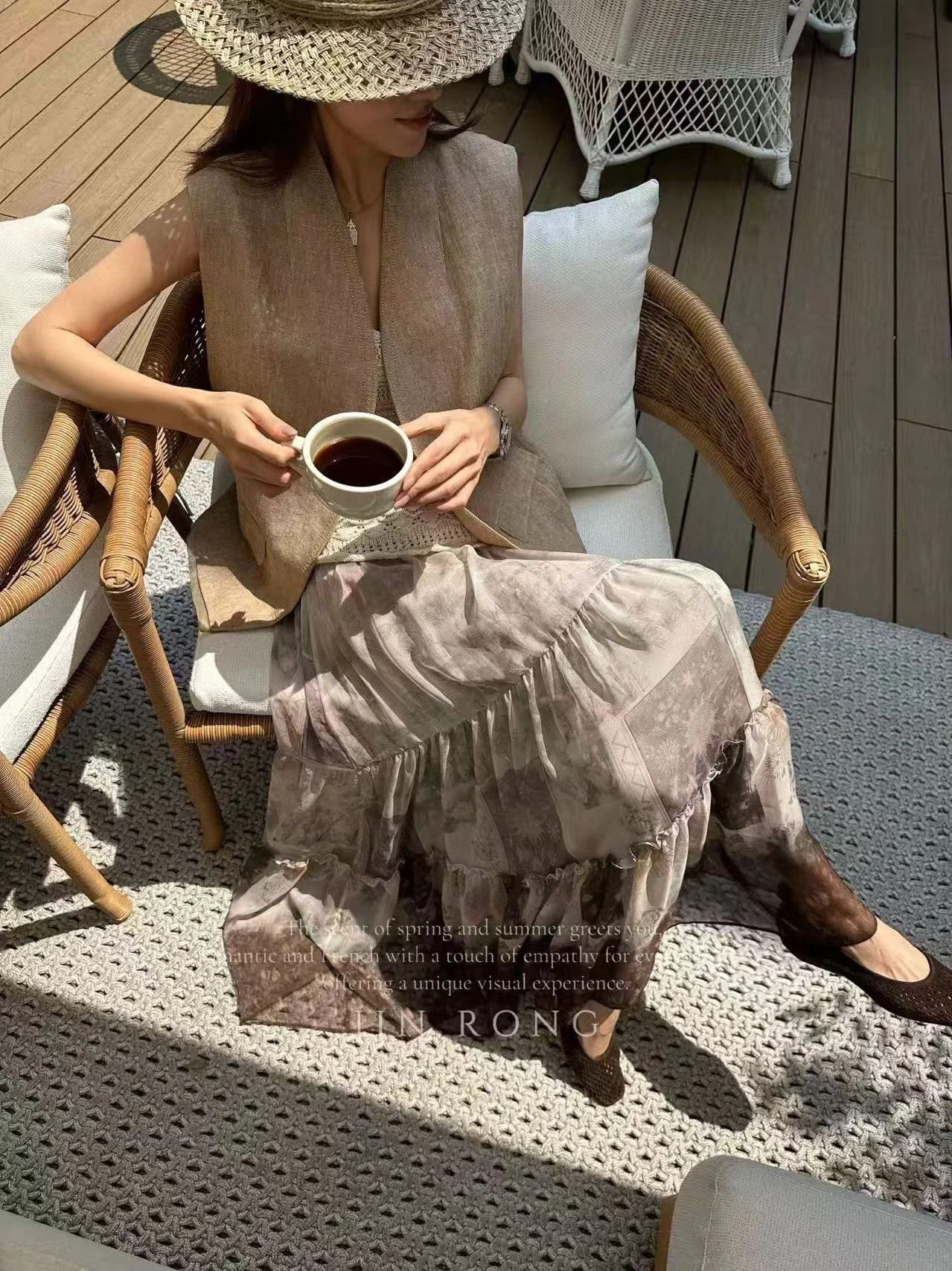 Crafted from lightweight and flowing tencel chiffon fabric with a sheer soft-focus texture, it boasts excellent drape and moves like a cloud with every step. The skirt is covered with ink wash floral prints, interweaving gradient shades of grey and brown, as if blending forest morning mist and retro floral scenery into the fabric—rich, luxurious, and full of hazy beauty under light and shadow.