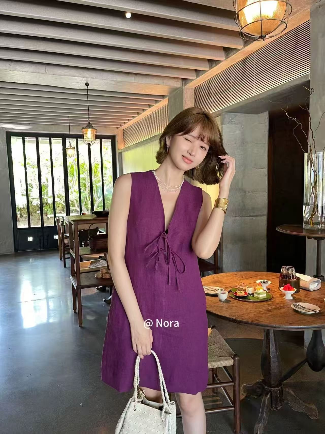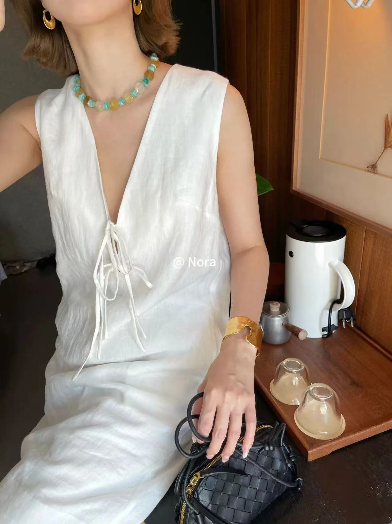 A summer atmosphere essential! This deep V-neck tie linen sleeveless dress is the soul piece for relaxed styling.