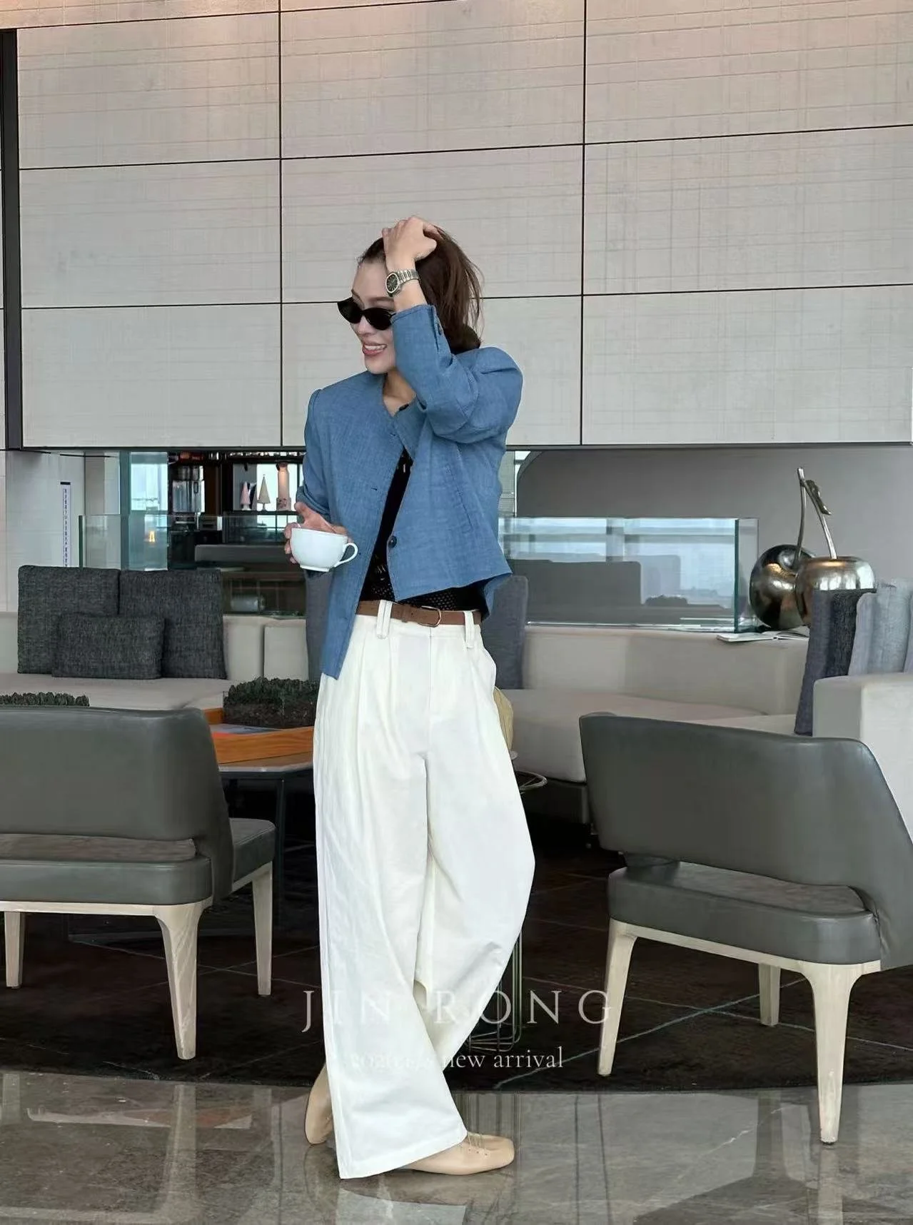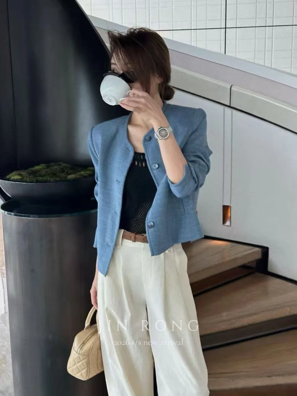 The collarless + single-breasted design is crisp and minimalist, flattering the neckline; the cropped, loose silhouette lifts the waistline and optimizes body proportions, making it easy for petite figures to wear. The adjustable cuff buttons add delicate details, and you can roll up the cuffs for a casual flair. Paired with white pants or a skirt, it easily unlocks the French commuting style, exuding laid-back luxury for daily outings or office commutes.