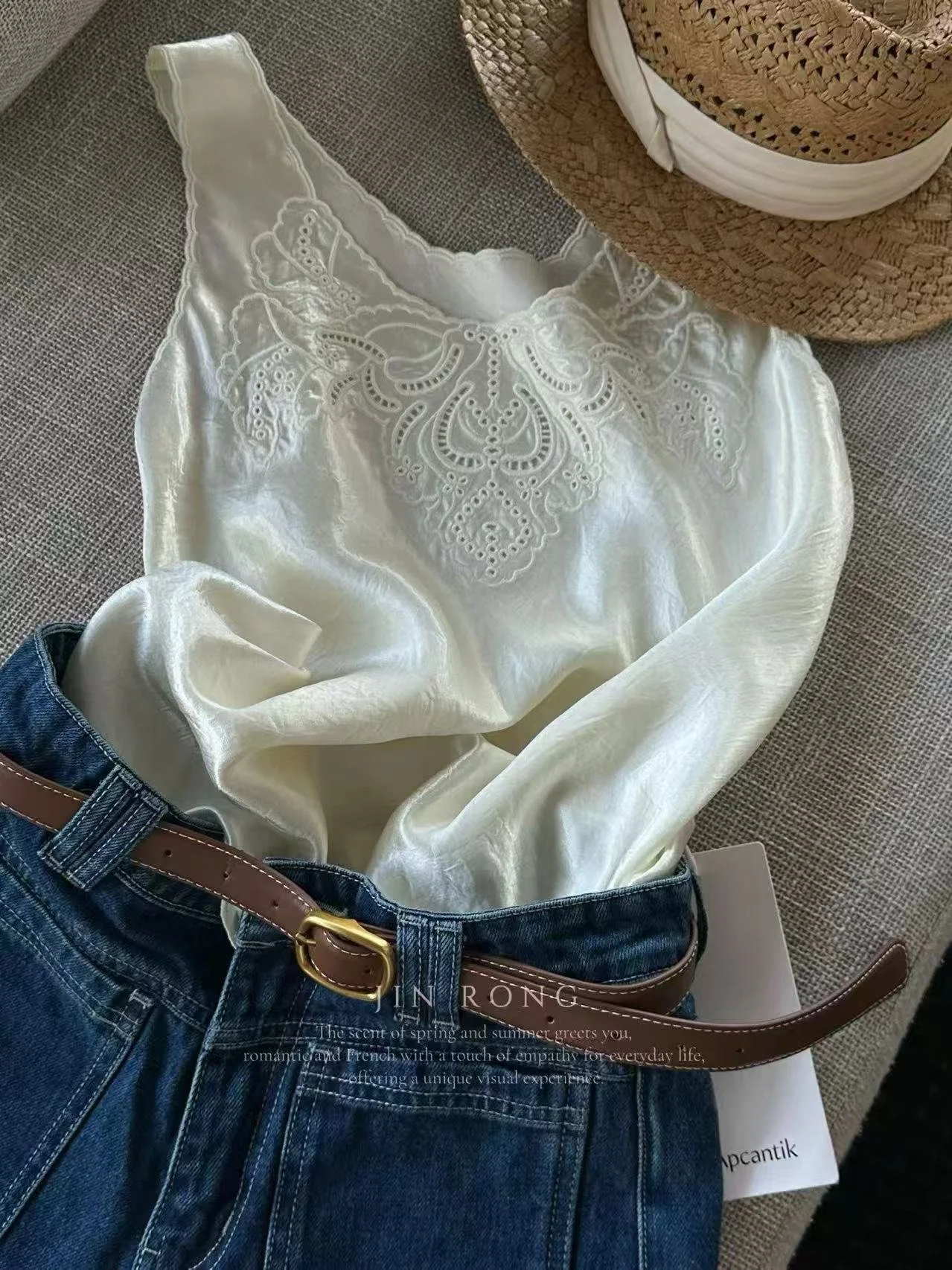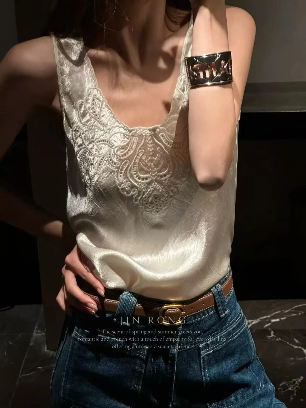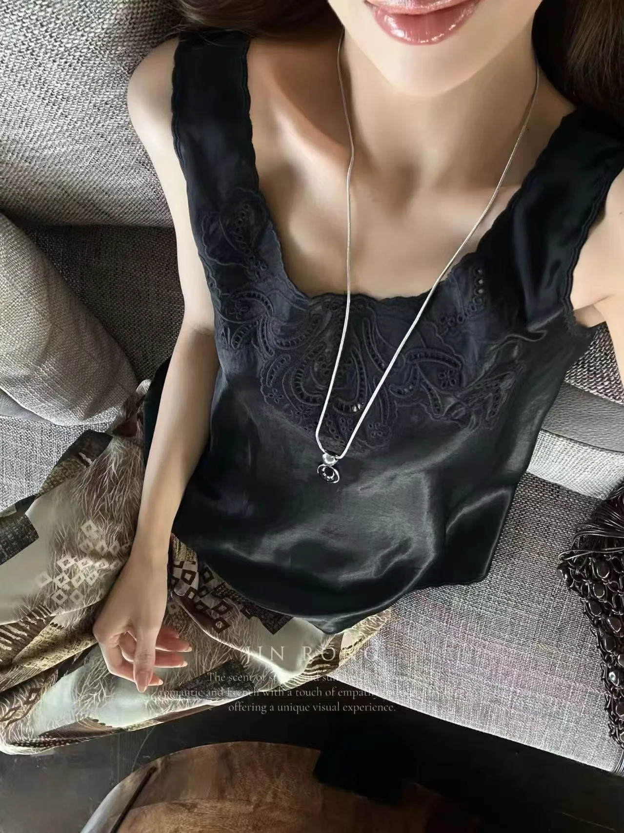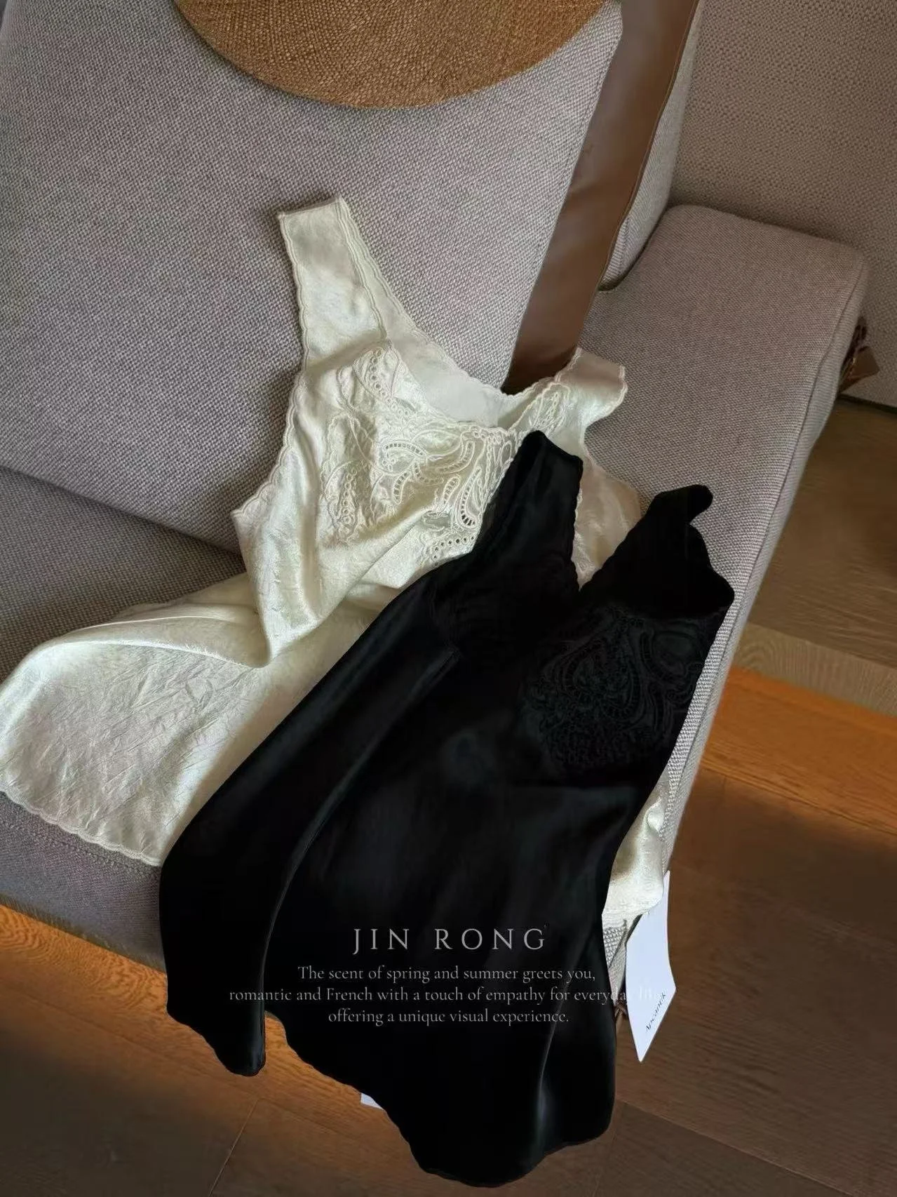 Crafted from smooth, drapey acetate satin fabric with a delicate soft-focus texture, it’s silky-smooth against the skin, breathable and sweat-free for spring and summer. The intricate paisley embroidery at the neckline is the highlight, with hollow lace and three-dimensional stitches interwoven—exquisitely complex yet elegant, revealing rich layers and luxury under light and shadow.