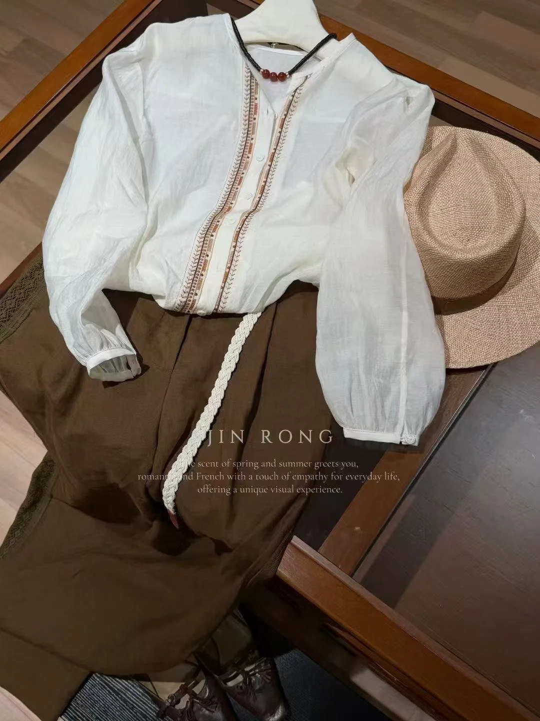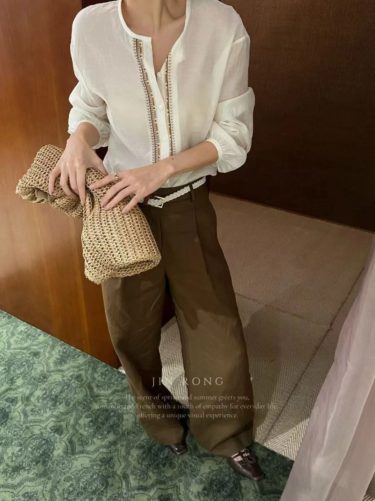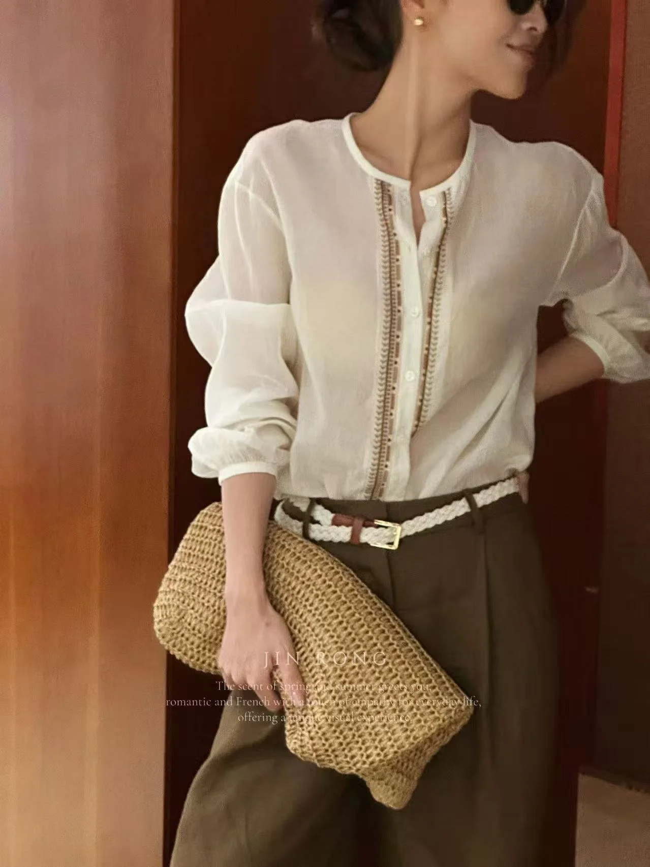 The half-placket + single-button design reveals delicate collarbones and flatters the neckline; the ethnic embroidered lace on the placket, interwoven with dark and light brown threads, exudes retro luxury in details; the puff sleeves with elastic cuffs flatter the arm lines, hiding flaws to suit all body types. Paired with brown pants or a skirt, it easily unlocks the French relaxed commuting style, exuding a laid-back luxury for daily outings or office commutes.