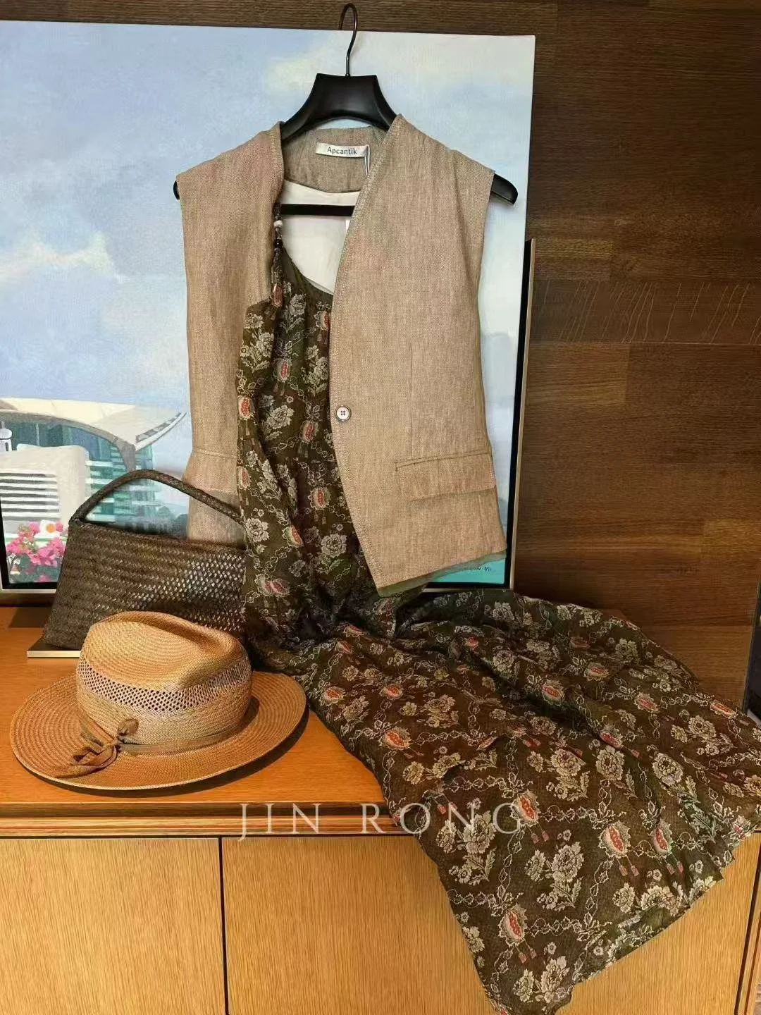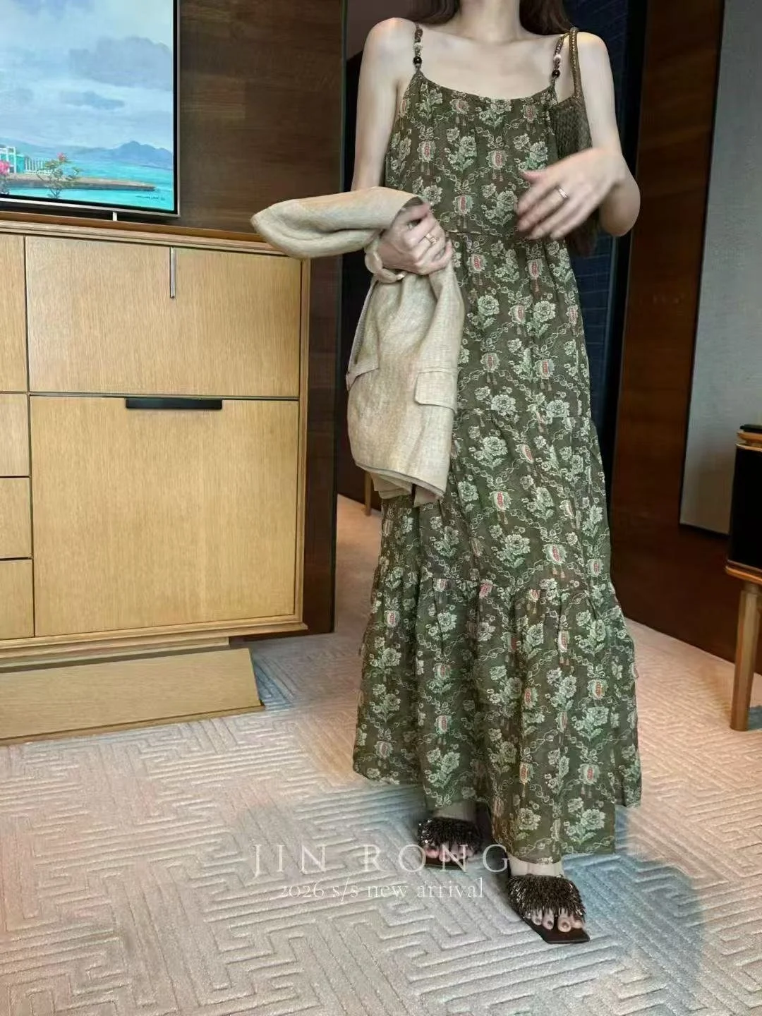 Vintage dark green base with gentle floral print, full of atmosphere. Thin spaghetti straps modify shoulder & neck. High-waist flared silhouette slims and hides flaws. Lightweight fabric flows elegantly, ideal for vacation & daily fairy-style wear.