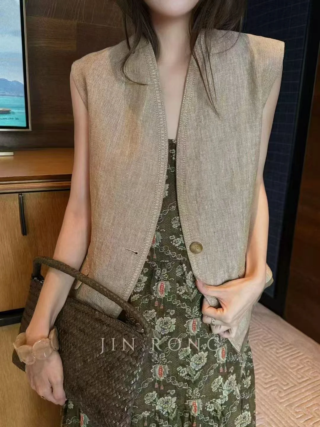 Made of breathable linen with premium vintage texture. Simple collarless blazer style with neat tailoring, flattering and versatile. Perfect for solo wear or layering, easily creating relaxed commute & casual looks.
